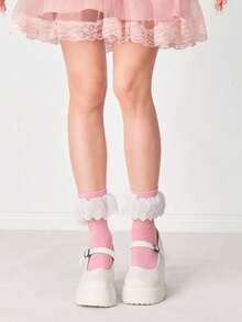 Kawaii 1 par de calcetines hasta el tobillo con encaje calado y volantes, calcetines cortos rosas dulces, calcetines versátiles de estilo escolar JK para mujeres