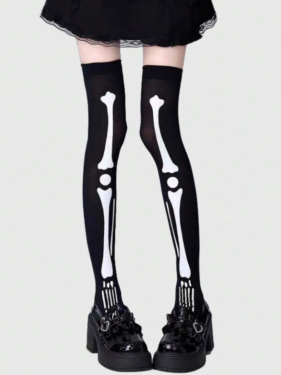 Grunge Punk 1 par de calcetines sobre la rodilla de estilo gótico con diseño de esqueleto