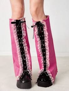 Grunge Punk 1 par de calcetines decorados con pines de leopardo estilo punk rock, calentadores de piernas acampanados de color rojo sólido con ribete de encaje estilo Y2K, apropiado para uso diario, festivales y atuendos de fiesta