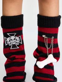 Anime 1 par de calentadores de piernas con diseño de calavera a rayas en blanco y negro, estilo gótico sexy para Halloween para mujeres