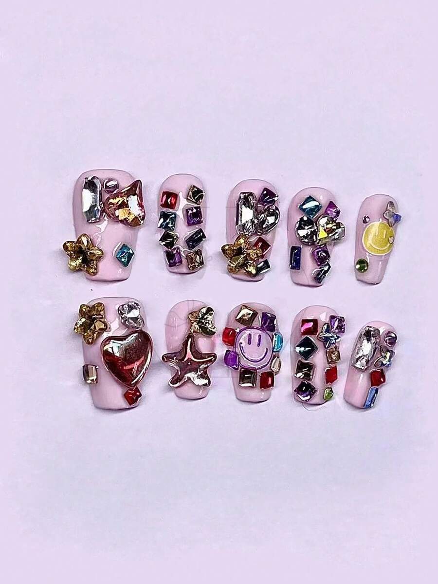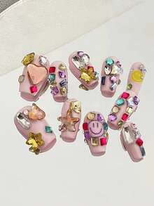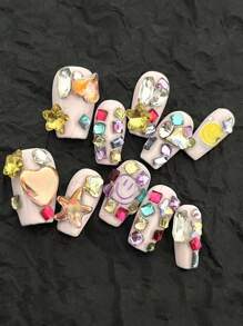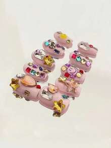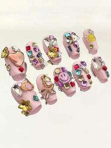 Kawaii 10 piezas largo ataúd cara de dibujos animados patrón con diseño de diamante de imitación Uña postiza Kit