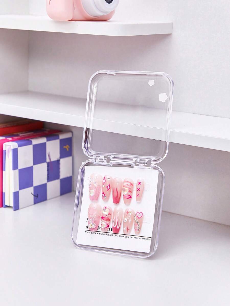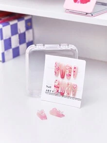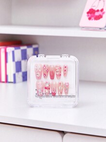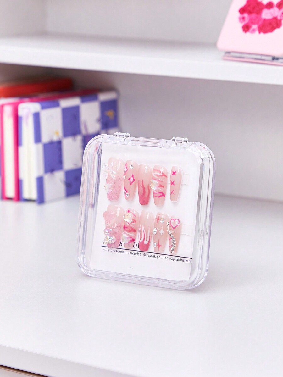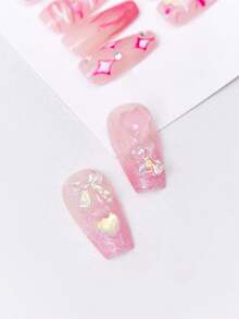 Kawaii 10 piezas largo ataúd con patrón de corazón lazo & con diseño de diamante de imitación Uña postiza Kit