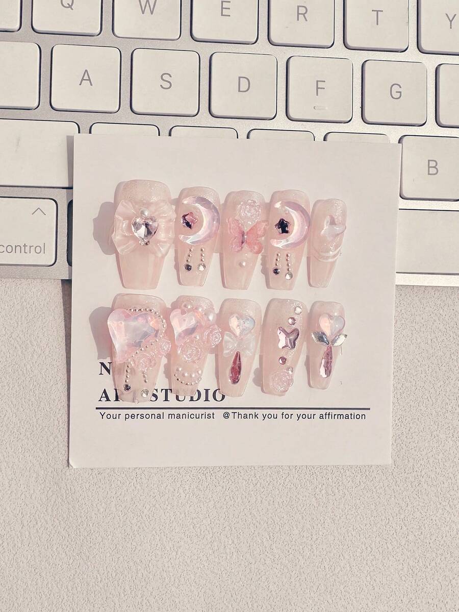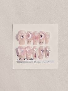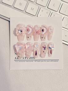 Kawaii 10 piezas Kit de uñas postizas con decoración de lazo y diamantes de imitación de ataúd largo