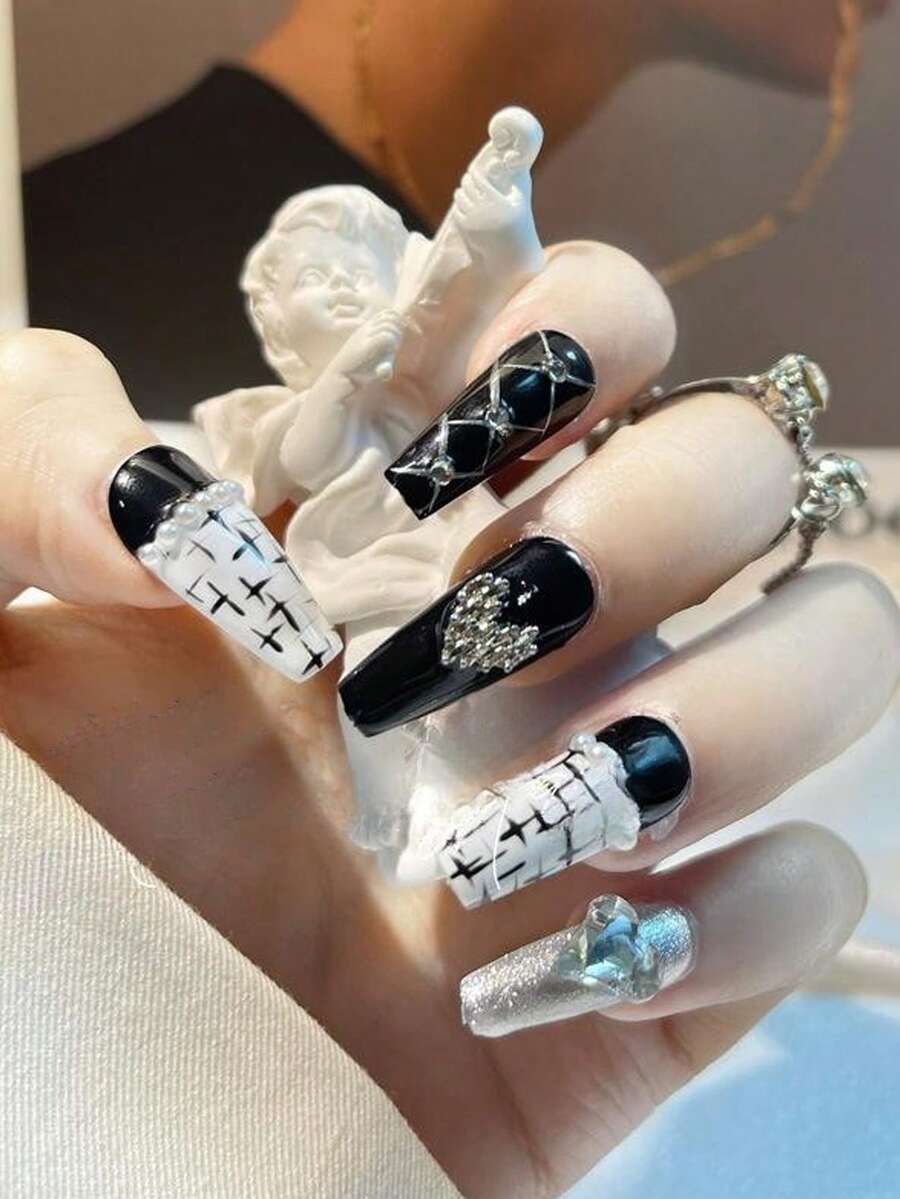 Goth 10 piezas largo ataúd con diseño de diamante de imitación Uña postiza Kit