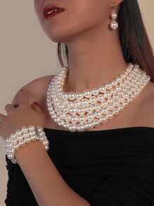 1 Pieza Collar De Cuentas De Perlas Falsas Y 1 Pieza Pulsera Y 1 Par De Aretes