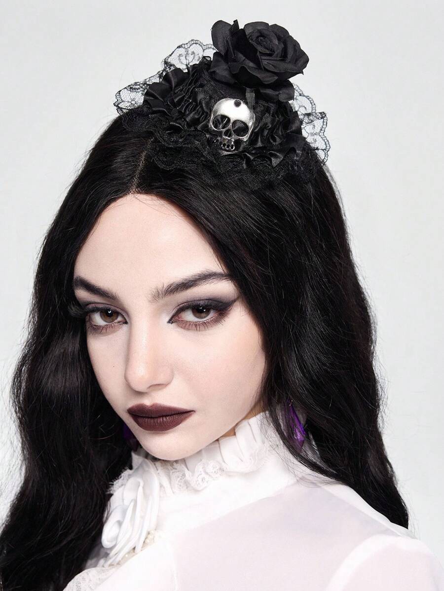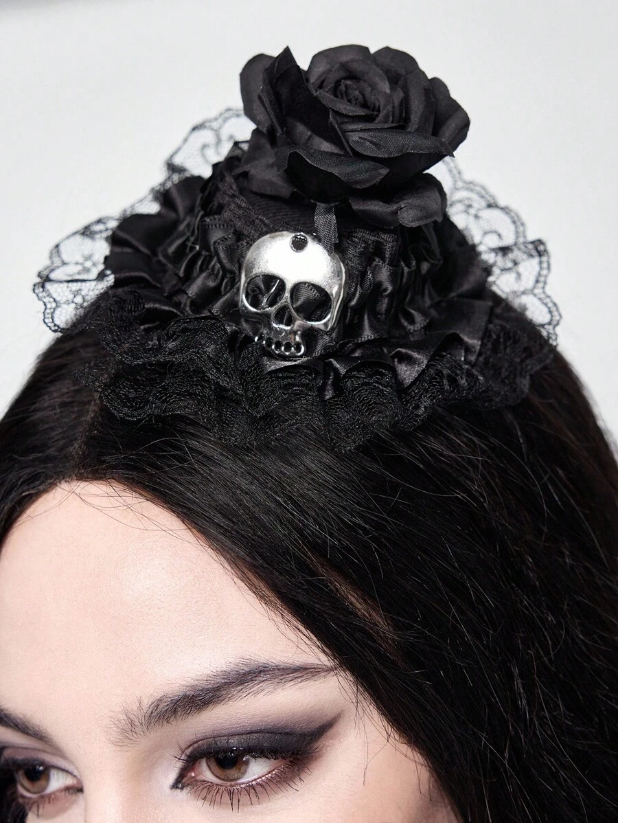 Grunge Punk 1 pieza Accesorio para el cabello de mini sombrero con diseño de calavera gótica y punk metal y rosa romántica con encaje, adecuado para citas/fiestas, se puede usar como sombrero de muñeca, Halloween