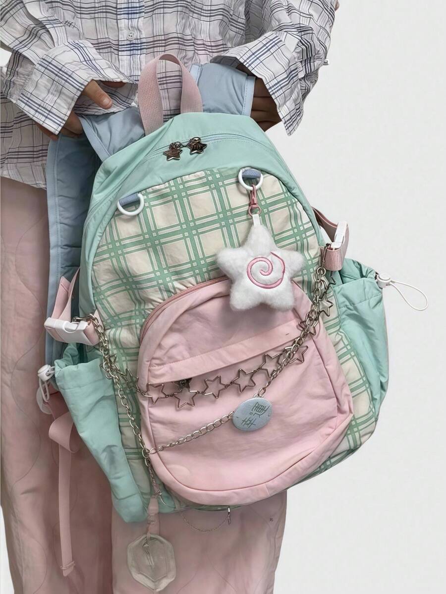 Anime 1 pieza Decoración con colgante de estrella de cinco puntas esponjosa, estilo dulce y Kawaii con estampado a cuadros rosado para mochila/bolso deportivo casual de mujer, adecuado para uso diario, deporte y viajes cortos