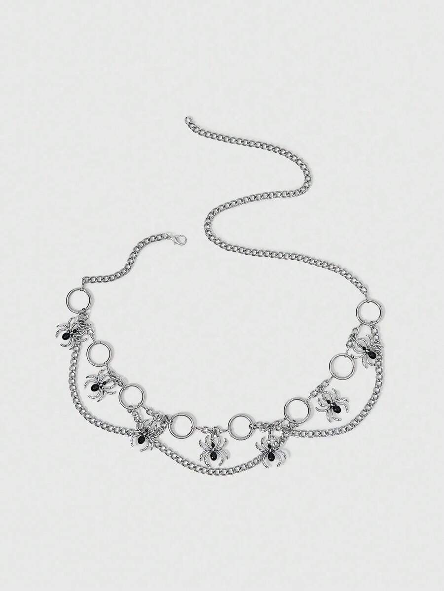 Goth 1 pieza Cinturón de cadena de mujer con araña de cristal circular plateada, decoración para vestidos góticos oscuros, adecuado para Halloween, uso diario versátil