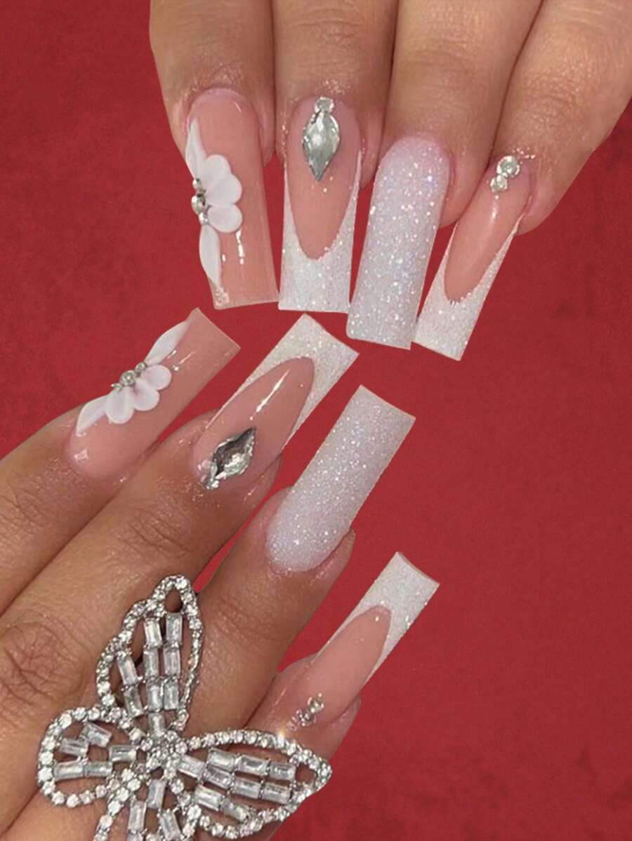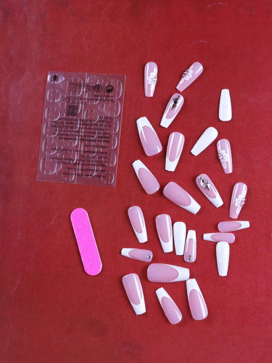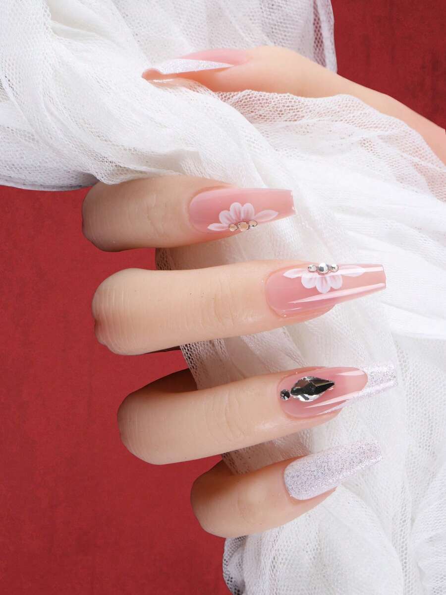 24 piezas largo ataúd 3d con diseño de diamante de imitación blingbling Uña postiza Kit