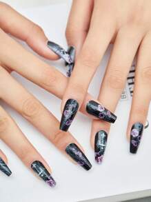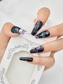 Goth 24 piezas largo ataúd floral & con patrón de cráneo Uña postiza Kit