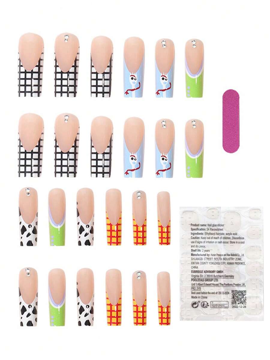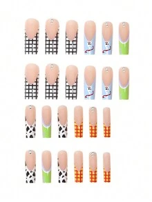 Kawaii 24 piezas largo ataúd de cuadros & con patrón de vaca Uña postiza Kit