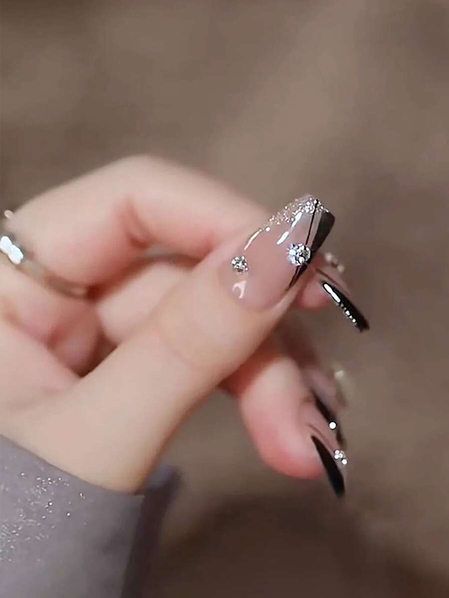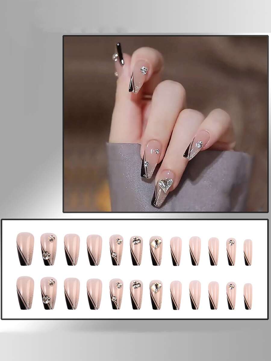 24 piezas Uña postiza largo ataúd con diseño de diamante de imitación