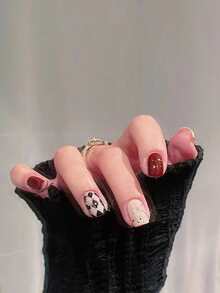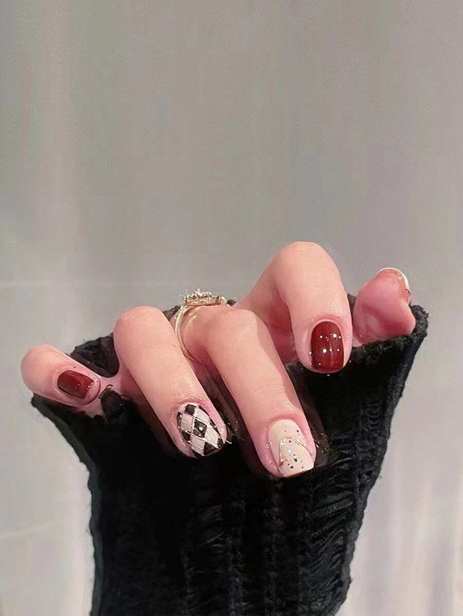 24 piezas Uña postiza corto cuadrado con patrón de cuadros & 1 hoja de cinta para uñas