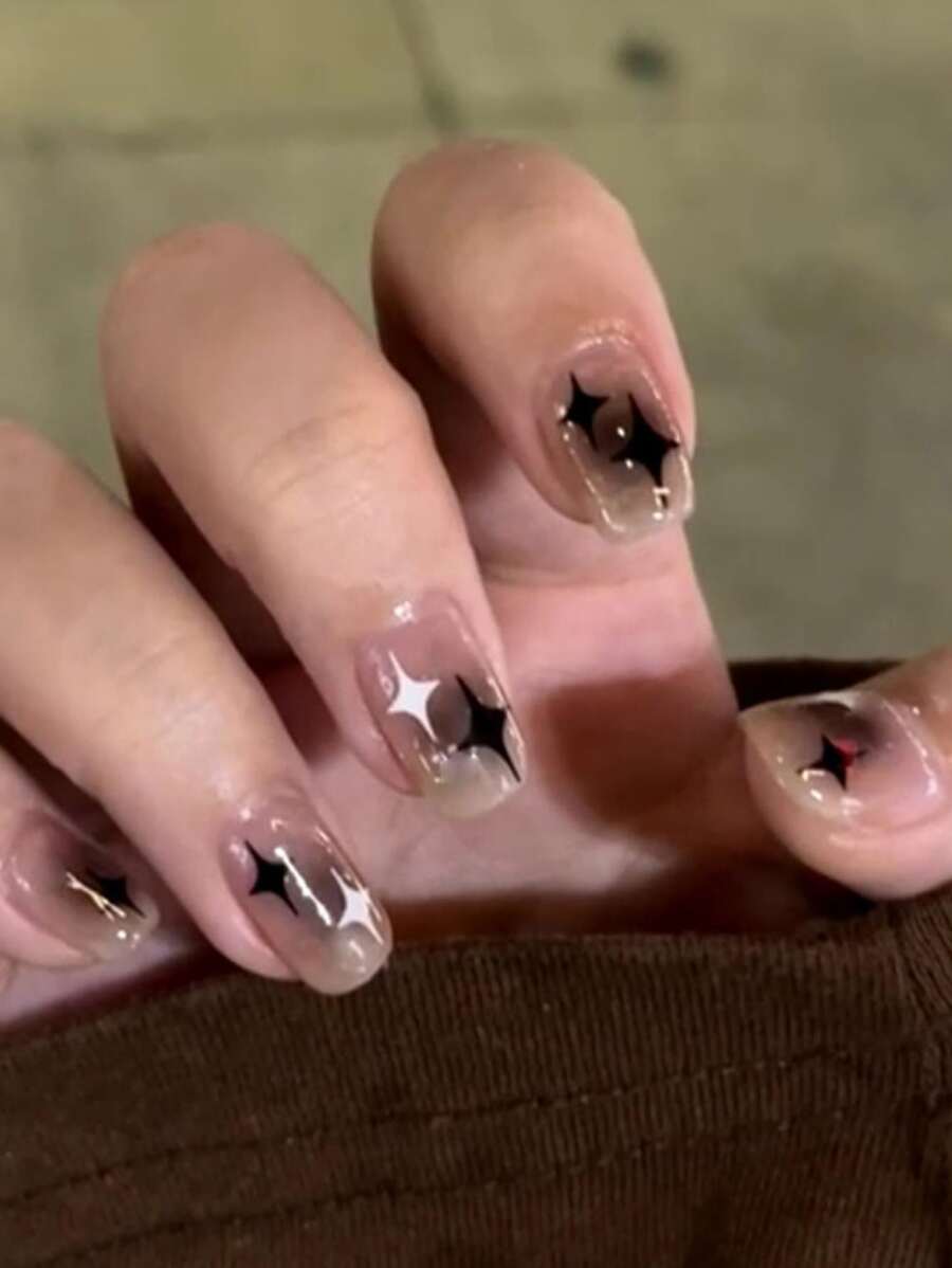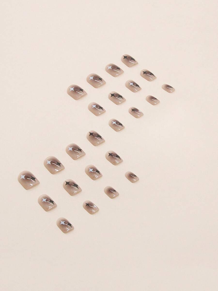 24 Piezas De Uñas Postizas Cuadradas Con Estampado De Estrellas Y 1 Hoja De Cinta