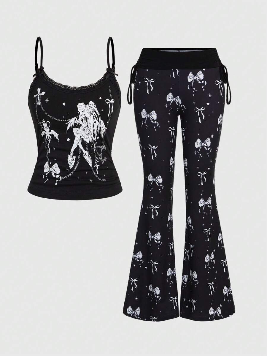 Set de 2 piezas: Top de tirantes con estampado de alas de chica anime linda y pantalones acampanados de cintura baja