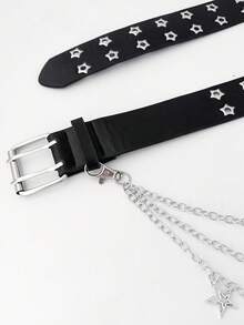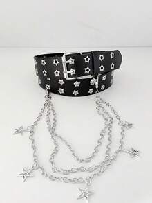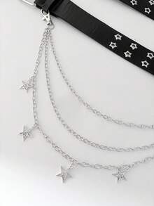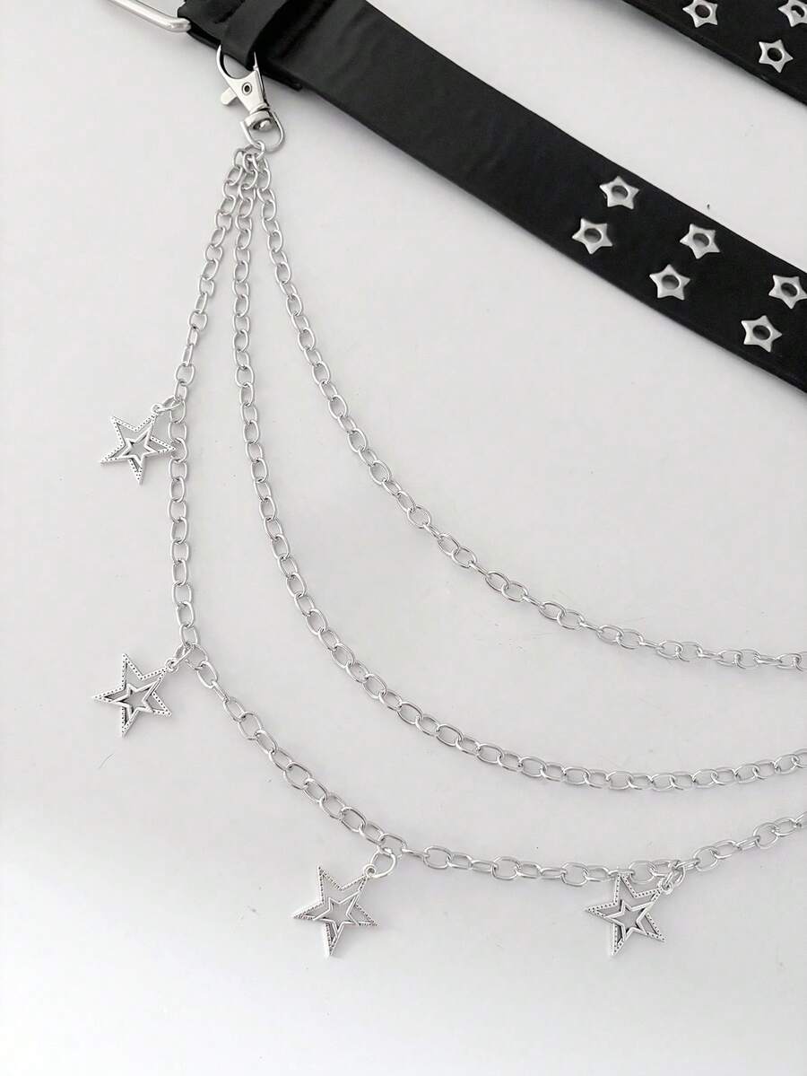 Goth Cinturón negro de doble con ojales y pentagrama para mujer (2 unidades) + cadena de triple capa con pentagrama hueco, ideal para vestidos, vaqueros y uso diario.