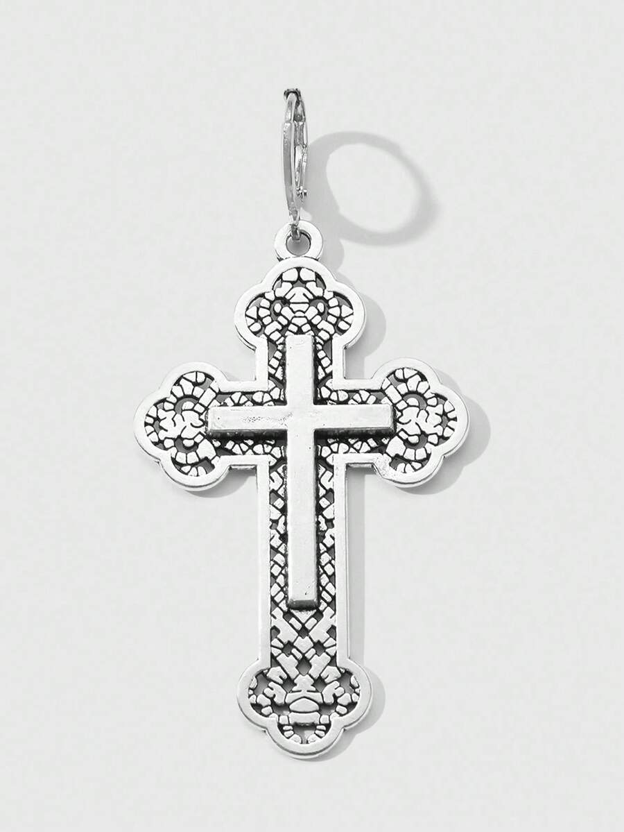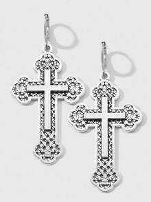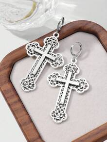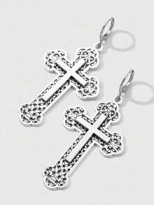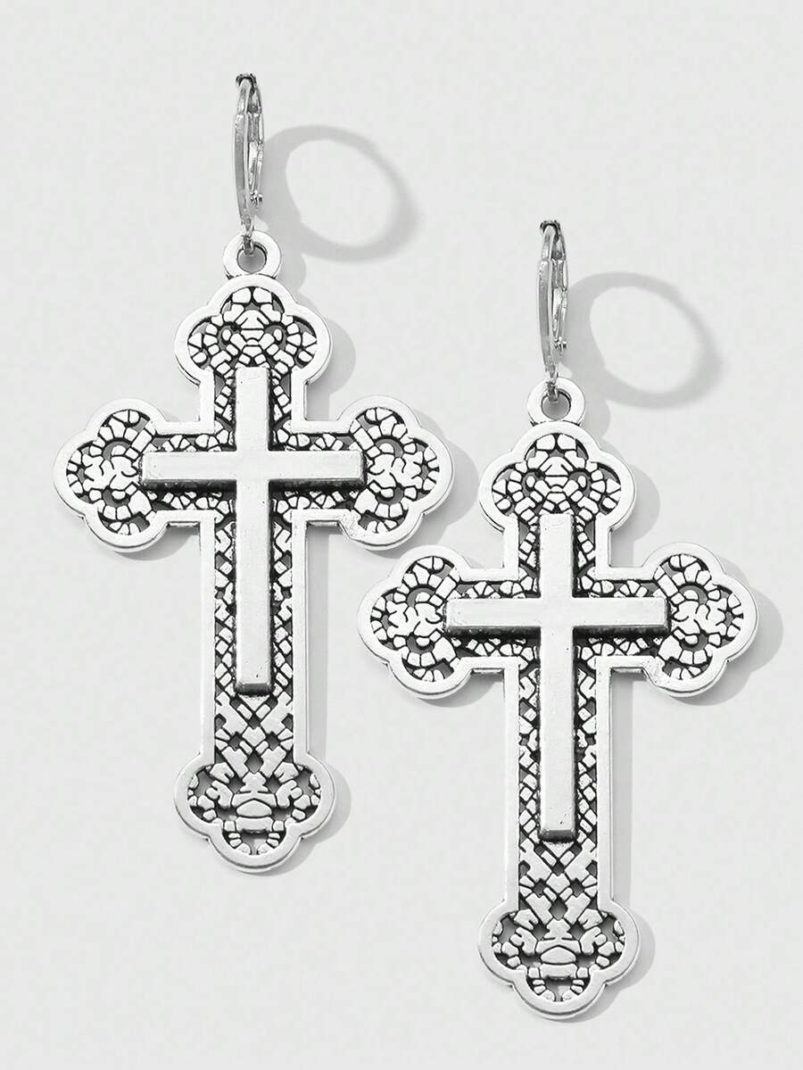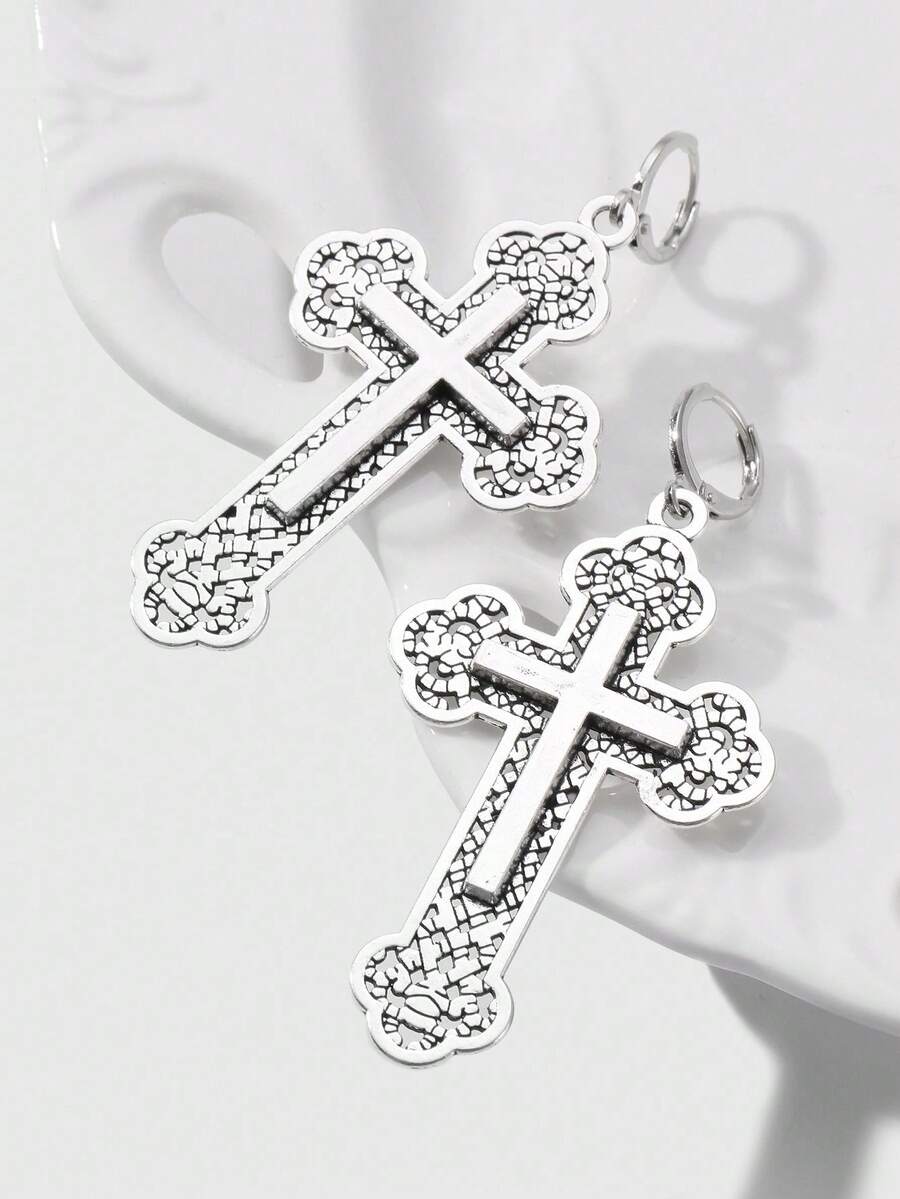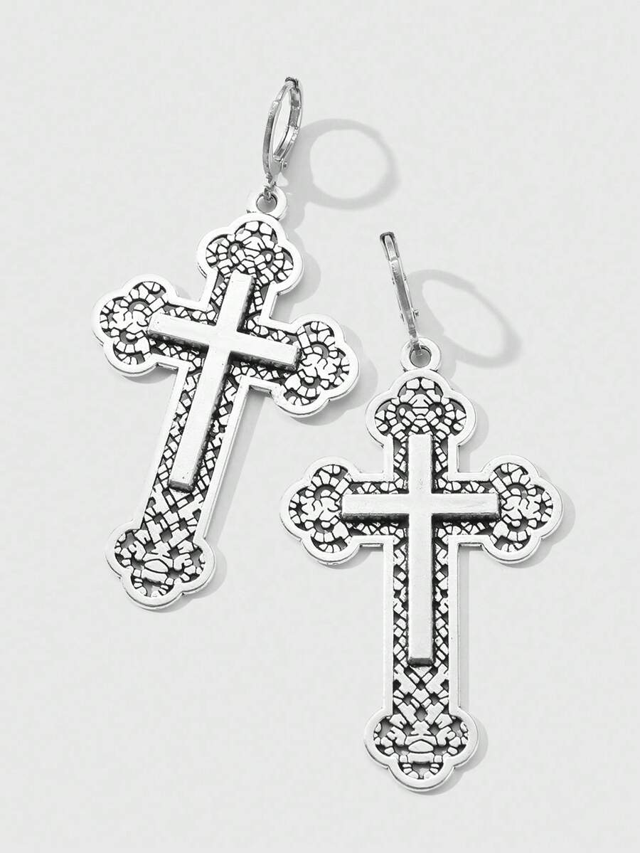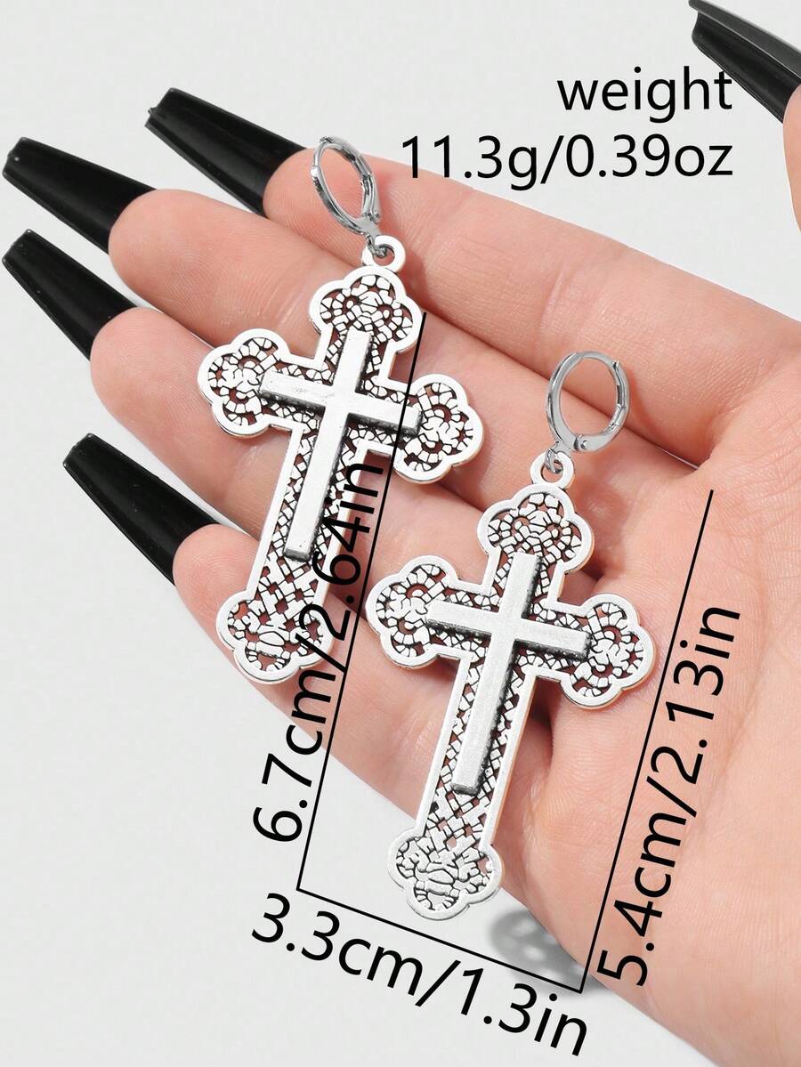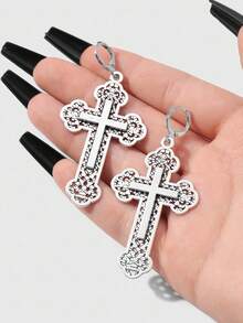 Goth Set de 2 pares de aretes colgantes con cruz floral hueca de estilo retro punk gótico Y2K plateados, adecuados para uso diario de mujeres, regalo para vacaciones
