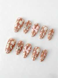 Kawaii 10 piezas de uñas postizas reutilizables en forma de almendra, color rosa suave, con moño floral, con gel de gelatina, hazlo tú mismo