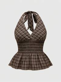 ROMWE Avant Conjunto de blusa de lunares franceses y blusa halter sin espalda a cuadros para mujer talla grande de regreso a la escuela