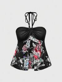Grunge Punk Camiseta de tirantes con cuello halter y estampado de calavera en contraste de color para mujer talla grande