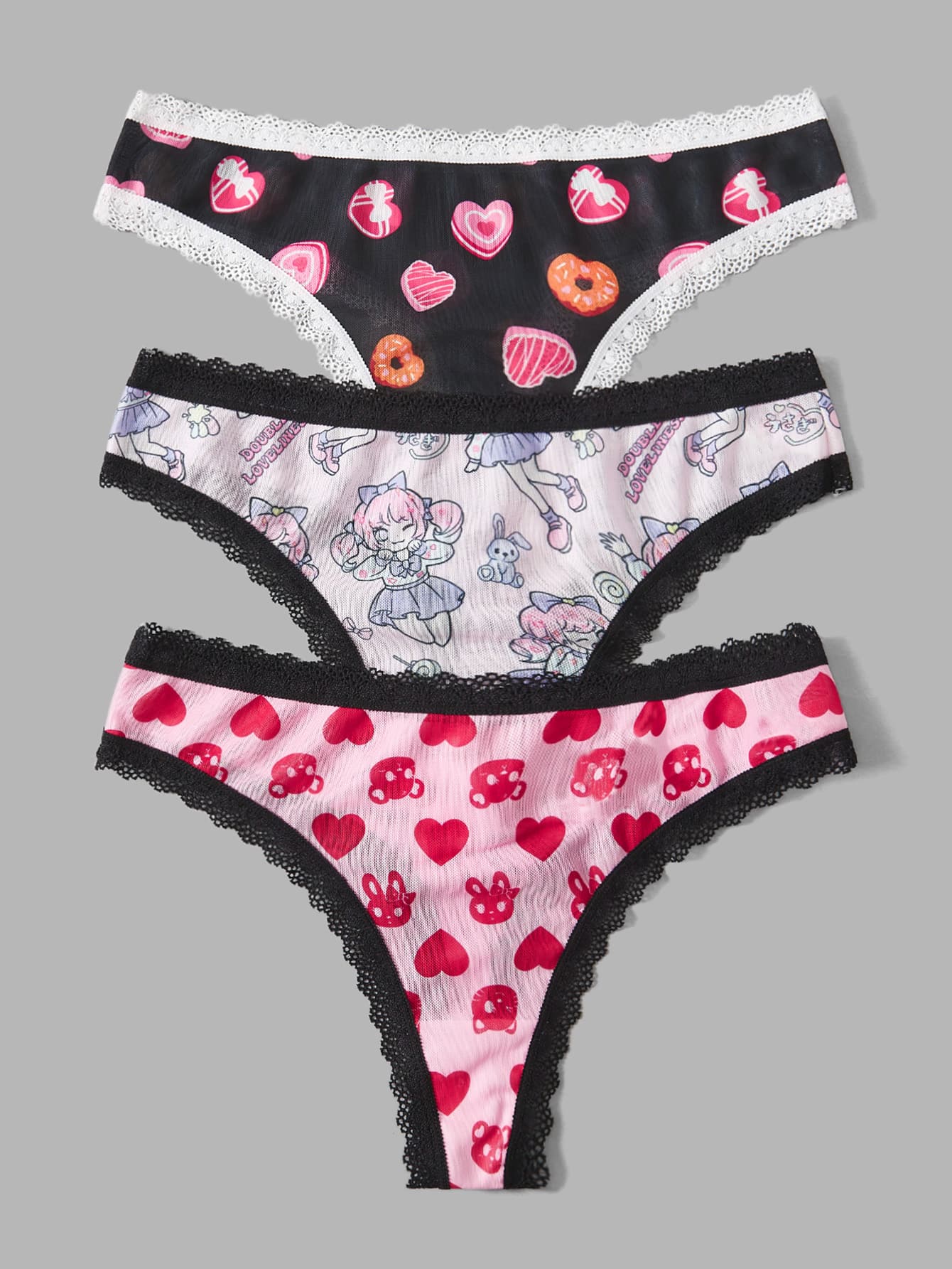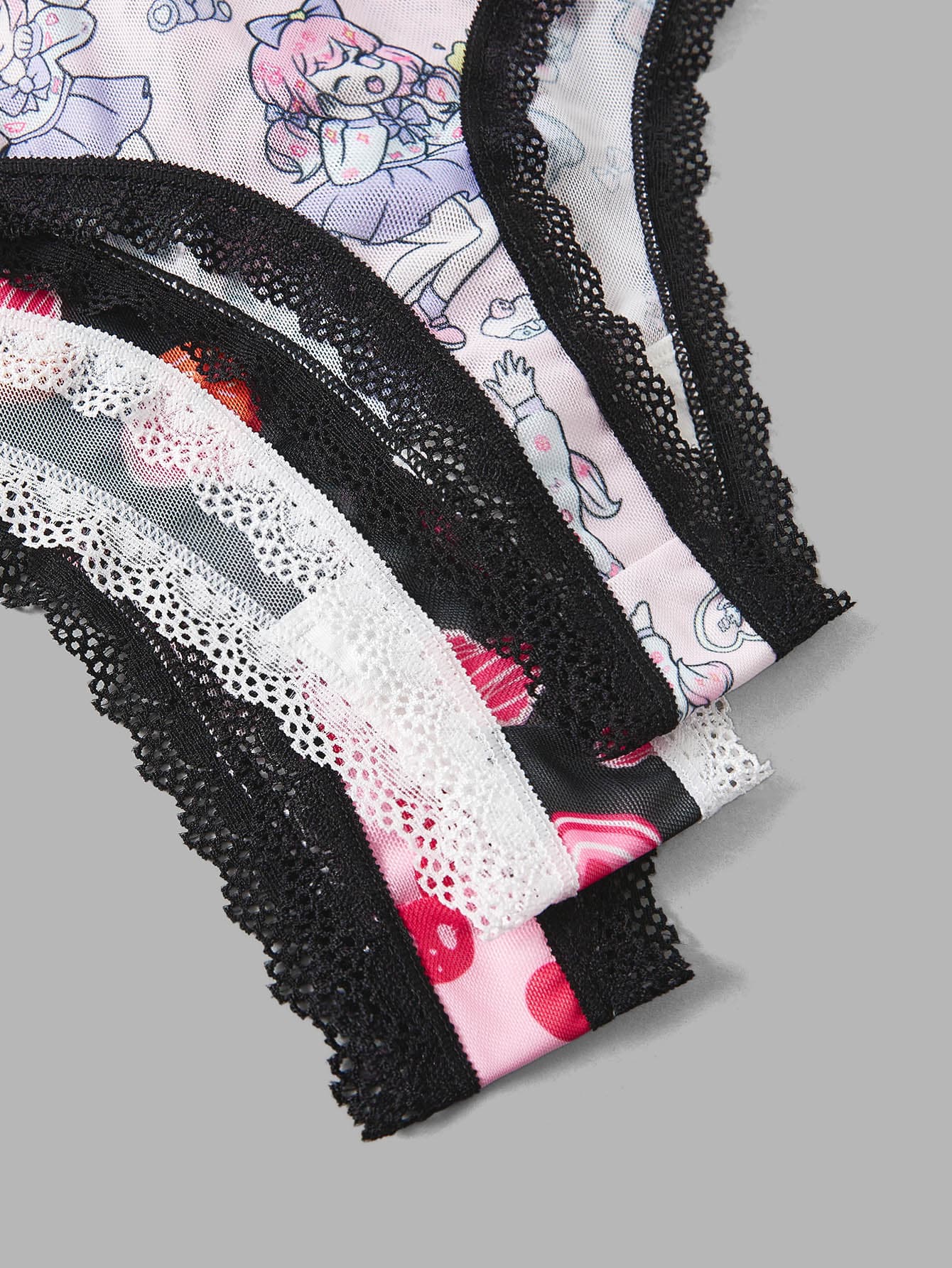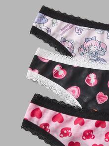 3 piezas Set bragas con estampado de dibujos animados con encaje en contraste
