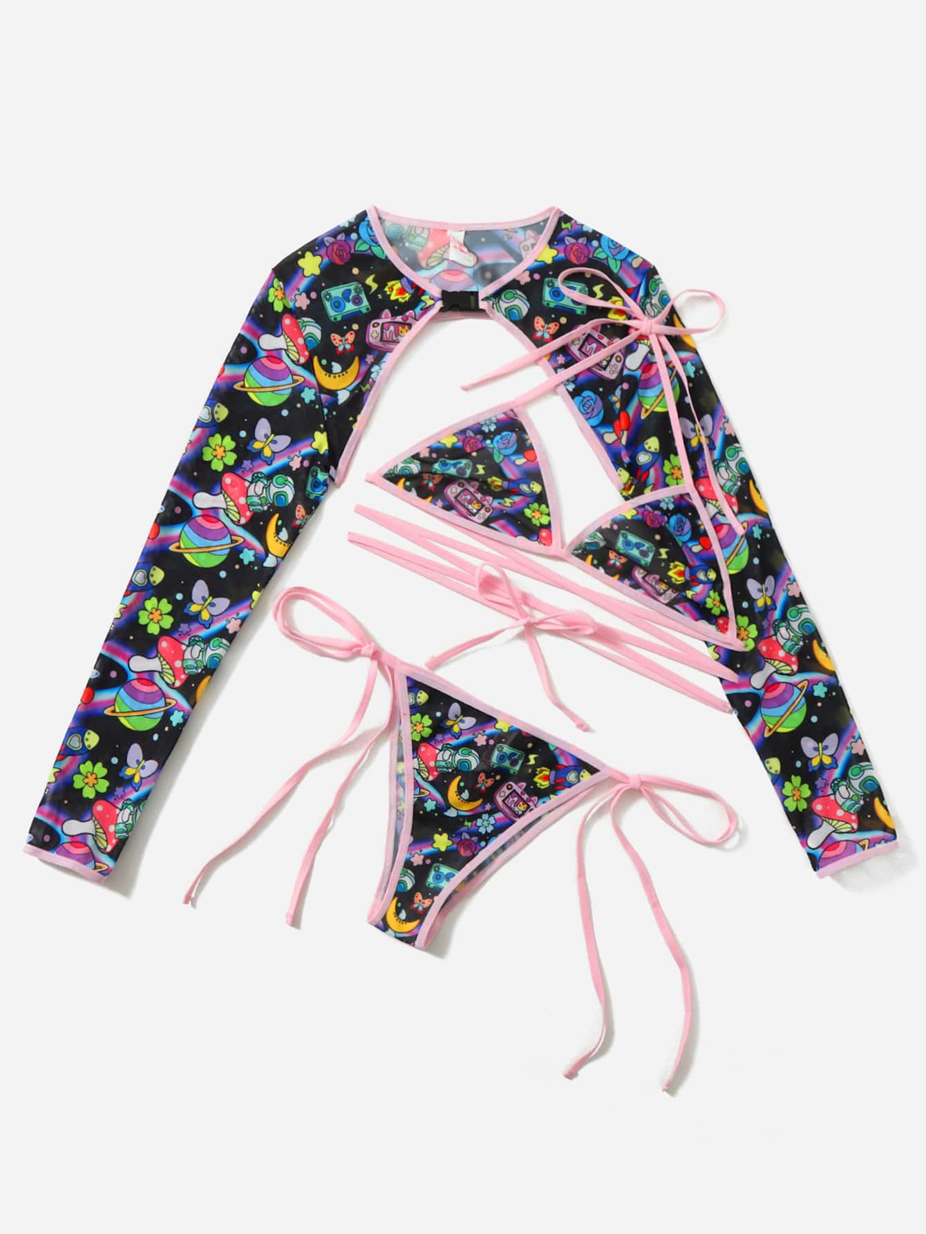 Street Life 3 piezas Set de lencería con estampado de dibujos animados unido en contraste con tira cruzada