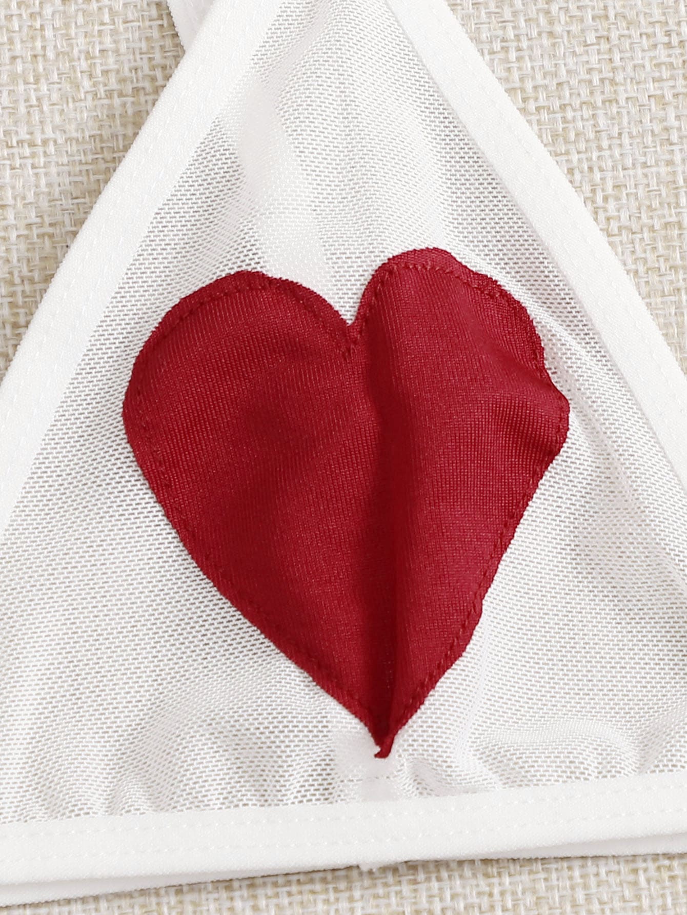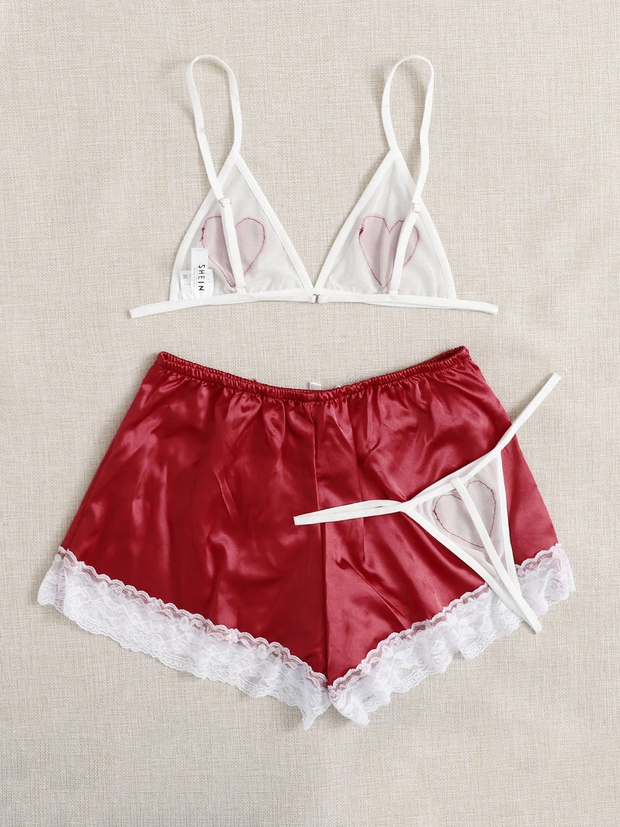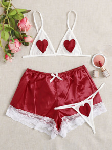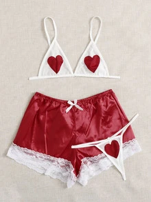 3 piezas Set de lencería con estampado de corazón ribete con encaje