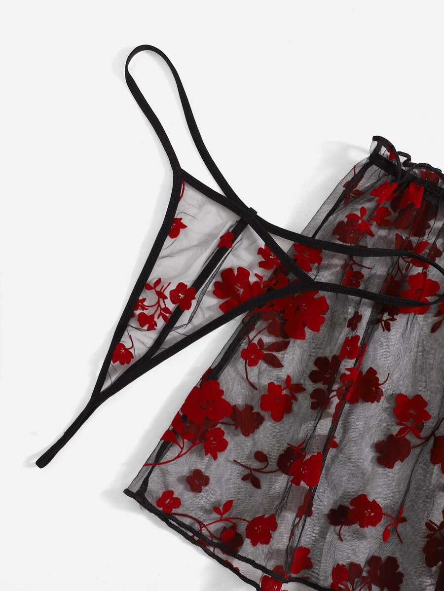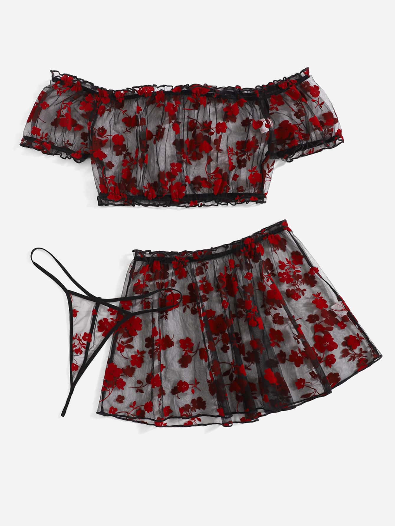 3 piezas con estampado floral de malla transparente Set de lencería & Falda