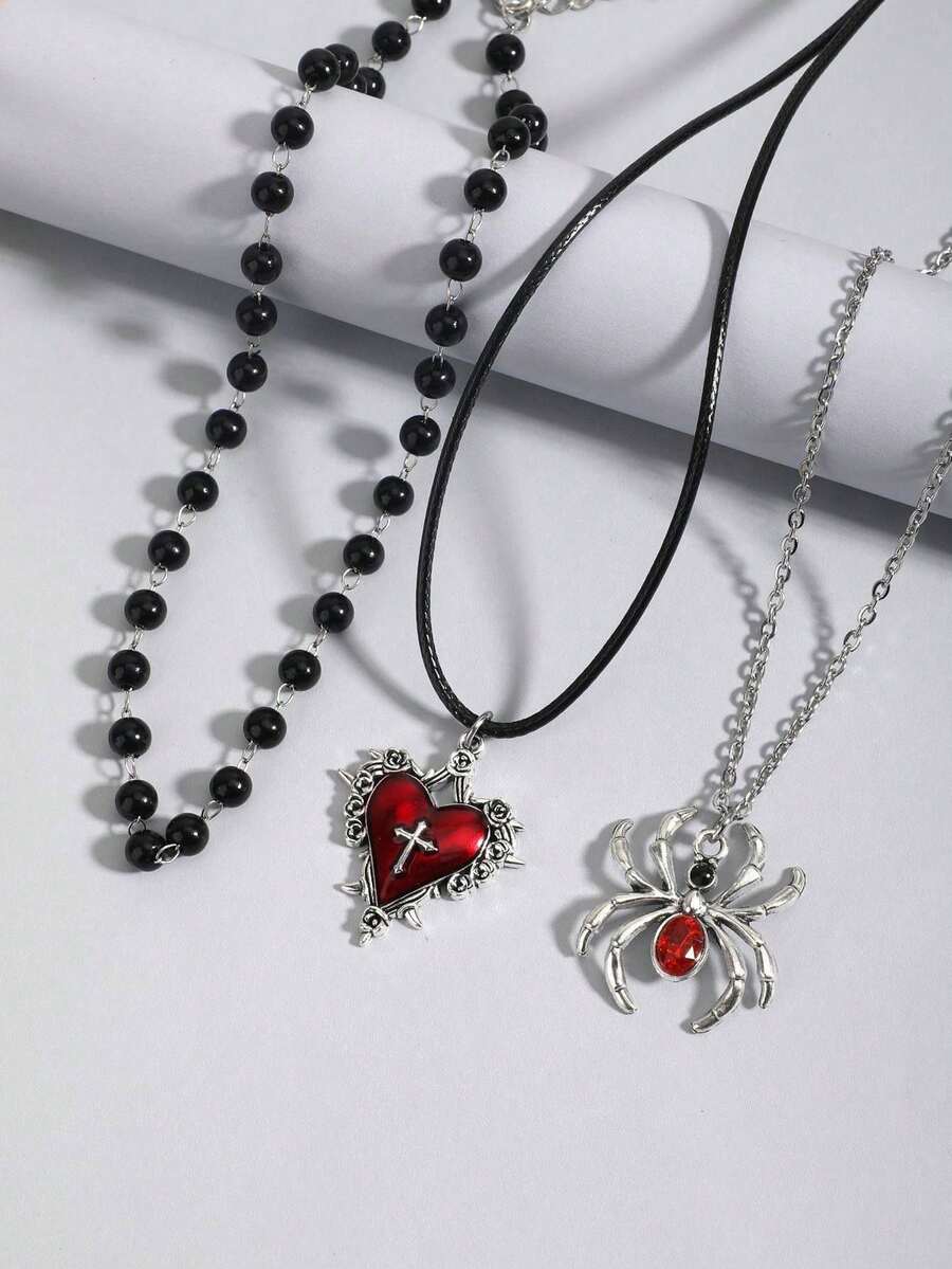 Grunge Punk Set de 3 collares con colgante de estilo gótico para mujer, con cuentas negras, rosa de espinas rojas, cruz y corazón