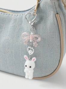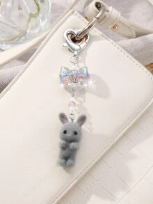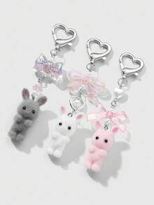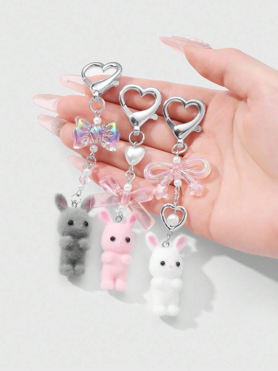 Kawaii Set combinado de 3 piezas con llavero y dije de moda minimalista y versátil estilo Ins: Moño hueco de resina, corazón de perlas falsas en blanco + rosa + gris, conejo de felpa falsa. Adecuado para mujeres, uso diario, regalo de vacaciones