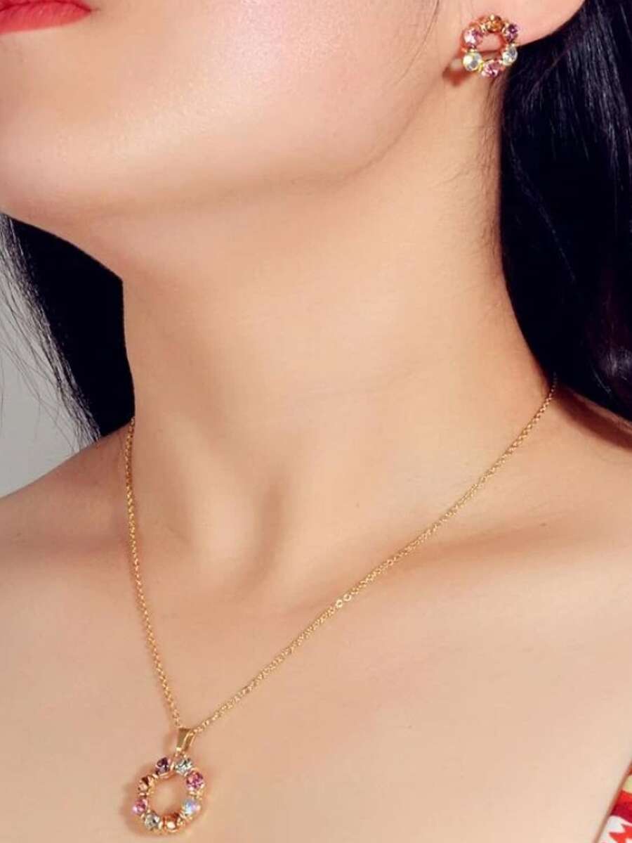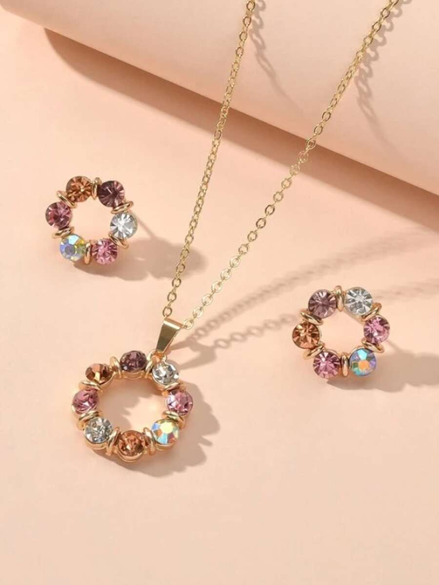 3 piezas Pendientes de botón con diamante de imitación con collar