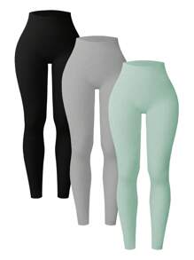 3 piezas mallas de Yoga de punto acanalado mallas de gimnasio sin costuras de estiramiento medio con Control de barriga