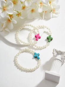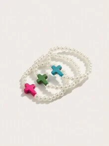 Juego De 3 Brazaletes Simples Con Cuentas De Perlas Y Cruces