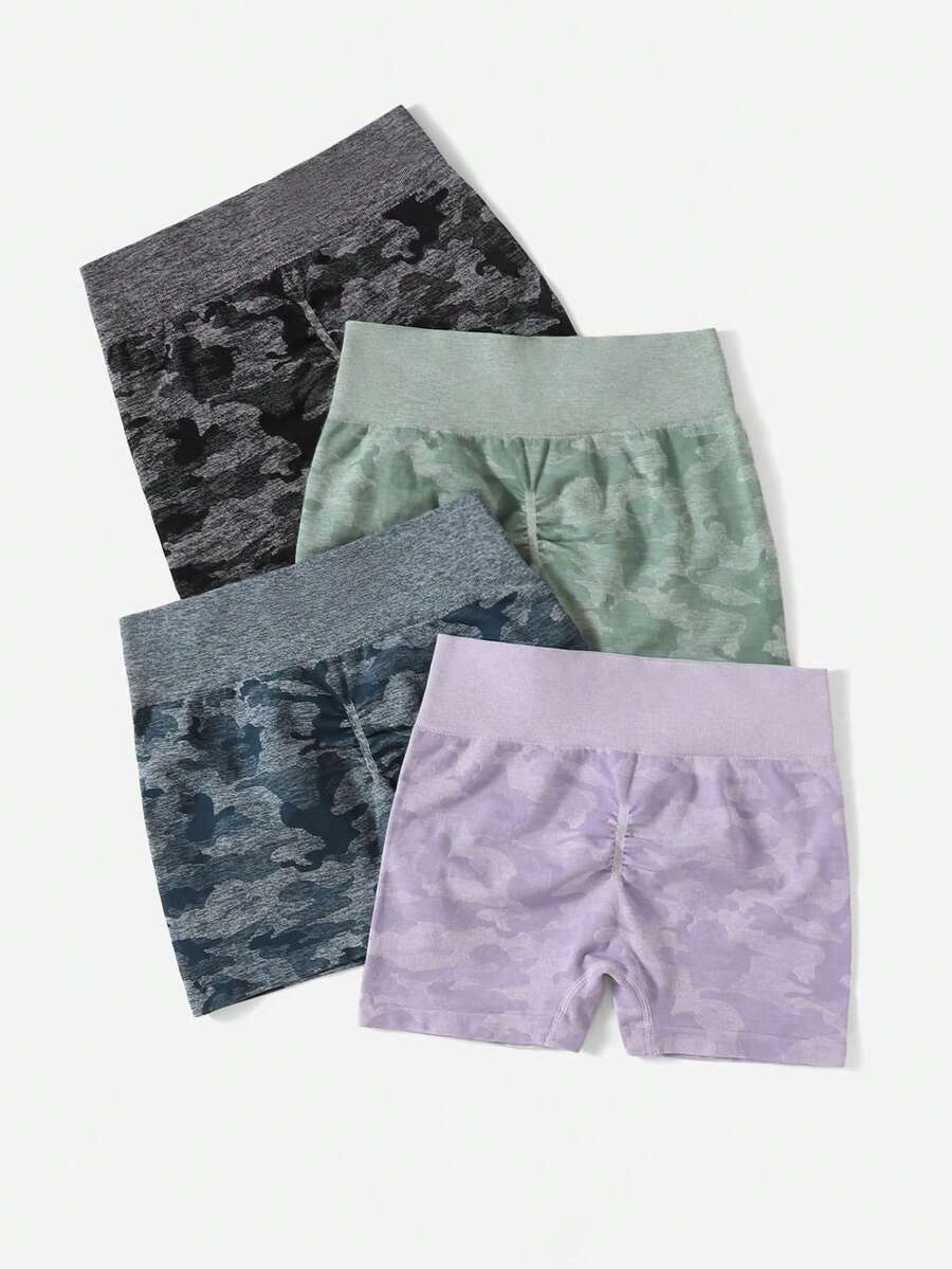 Conjunto de 4 pantalones cortos deportivos sin costuras con estampado de camuflaje, pantalones cortos elásticos
