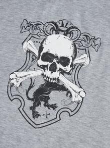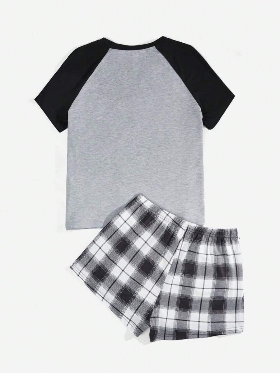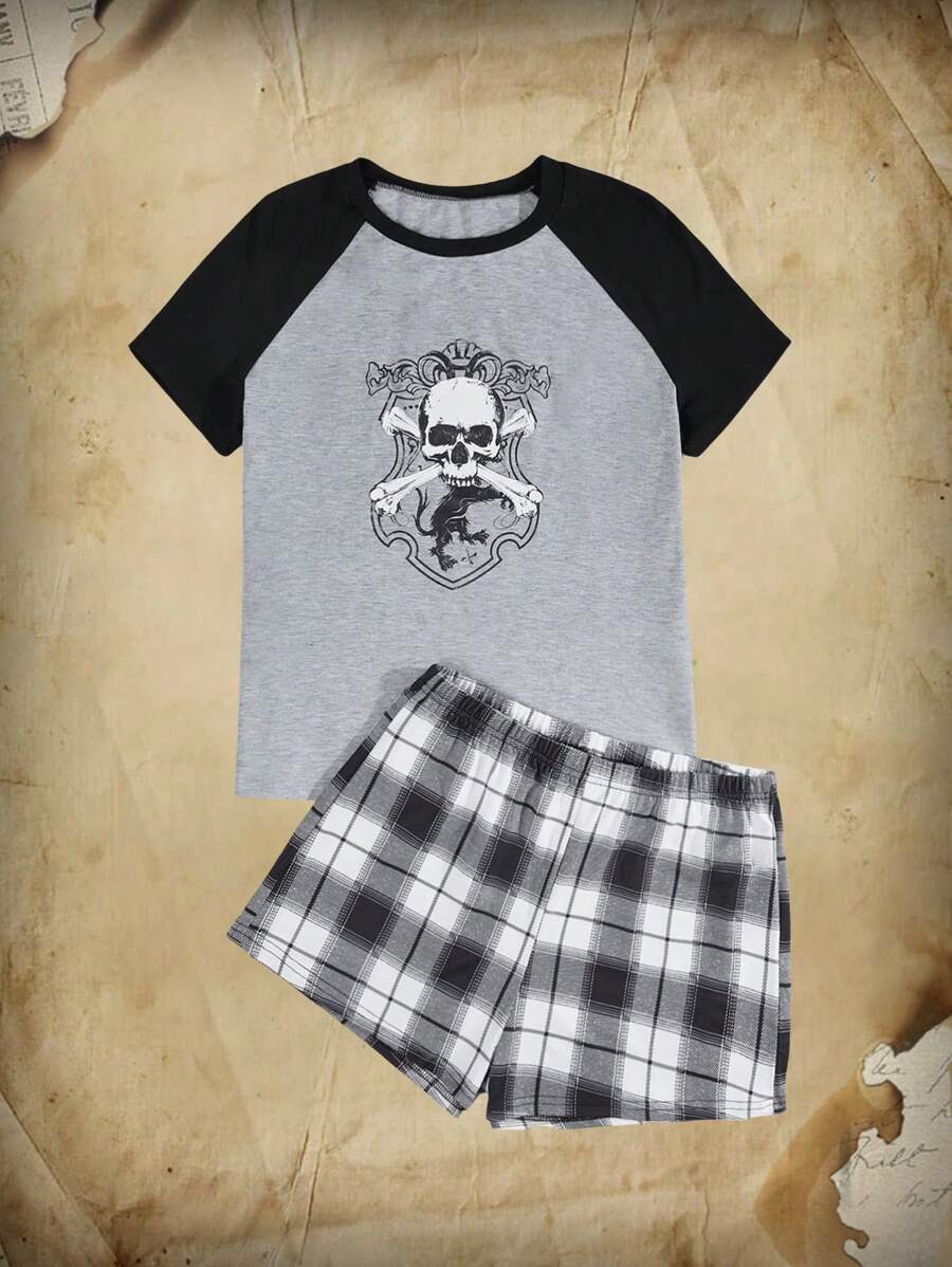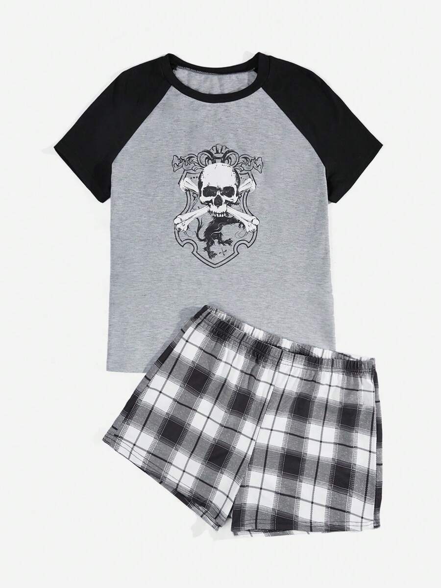 Academia con estampado de cráneo de manga raglán Camiseta & de cuadros Shorts Conjunto de pijama