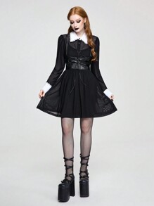 Academia Vestido de encaje transparente con cuello de parches de unicolor y fruncido para mujer