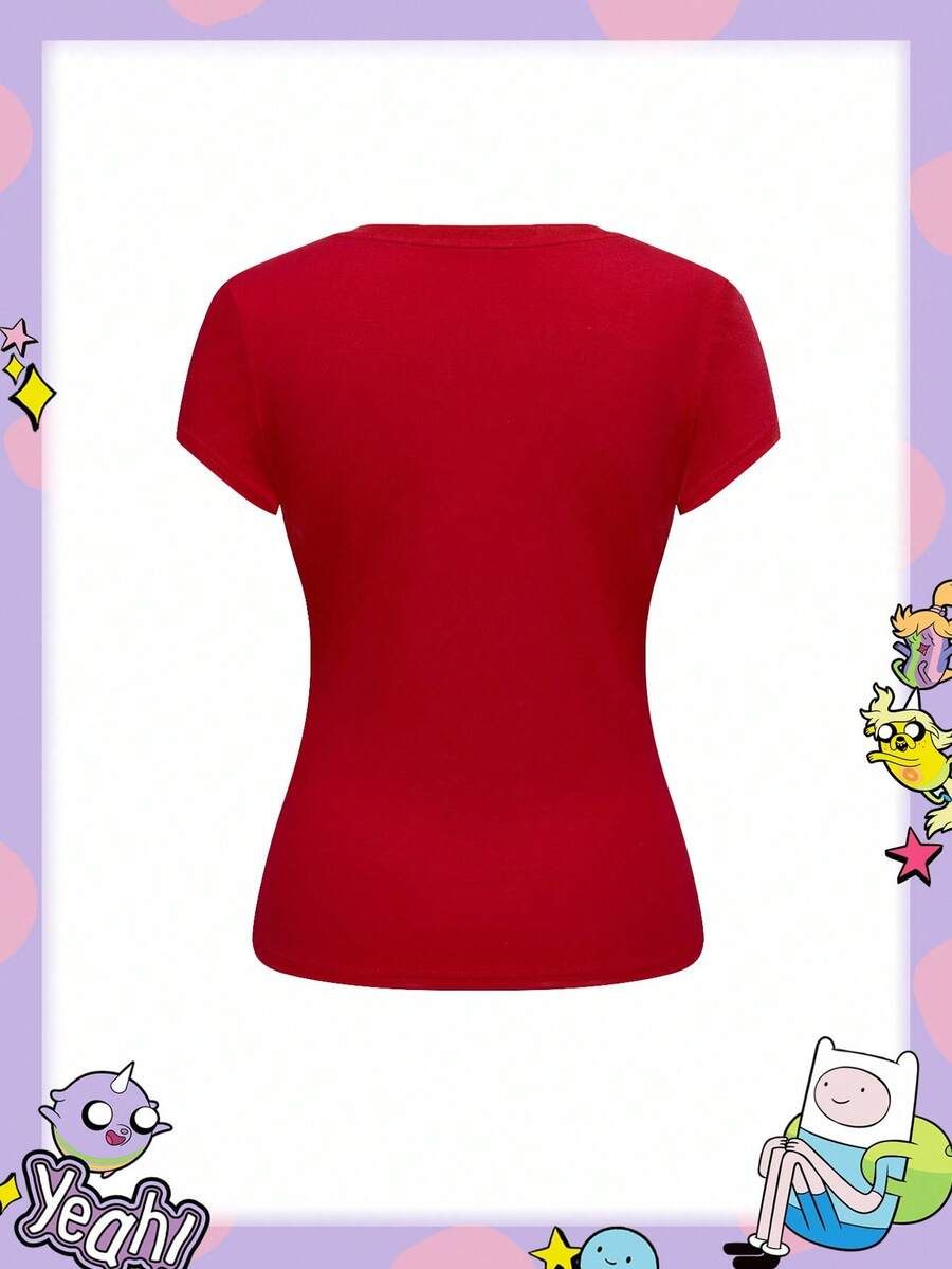 Adventure Time X ROMWE Camiseta casual de mujer con cuello en V, estampado gráfico de dibujos animados, ajuste ceñido, estilo streetwear Y2K, otoño