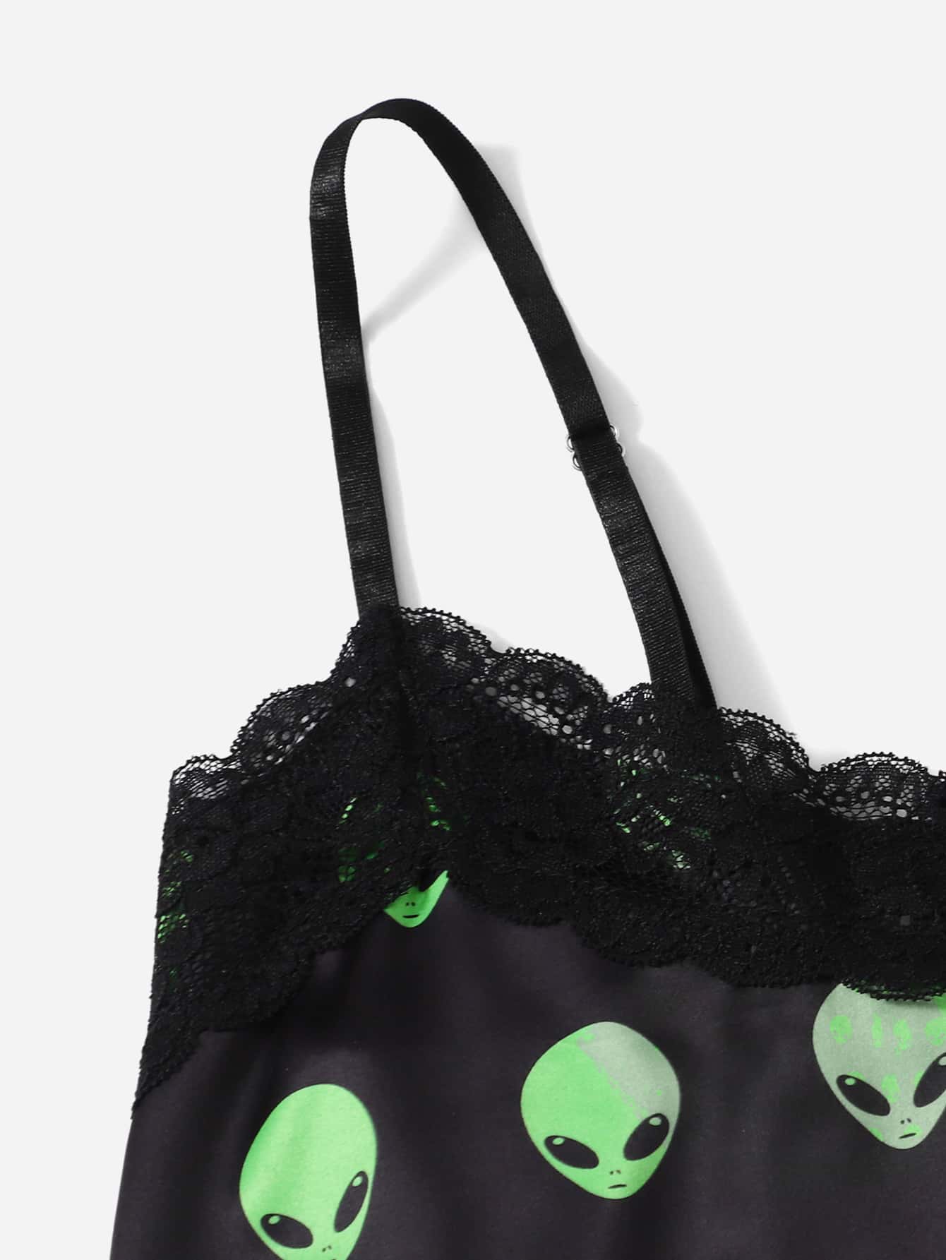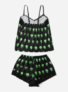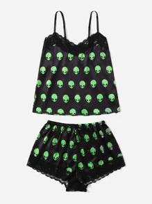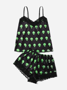 Conjunto de pijama con estampado de extraterrestre con encaje en contraste