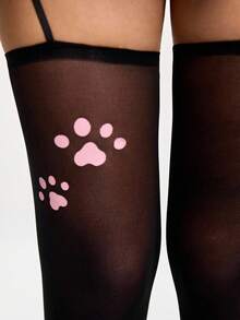 Anime 1 par de medias tirantes con estampado de patita de gatito adorable, medias transparentes negras sólidas y sexys, pantimedias elásticas adelgazantes, mallas negras delgadas