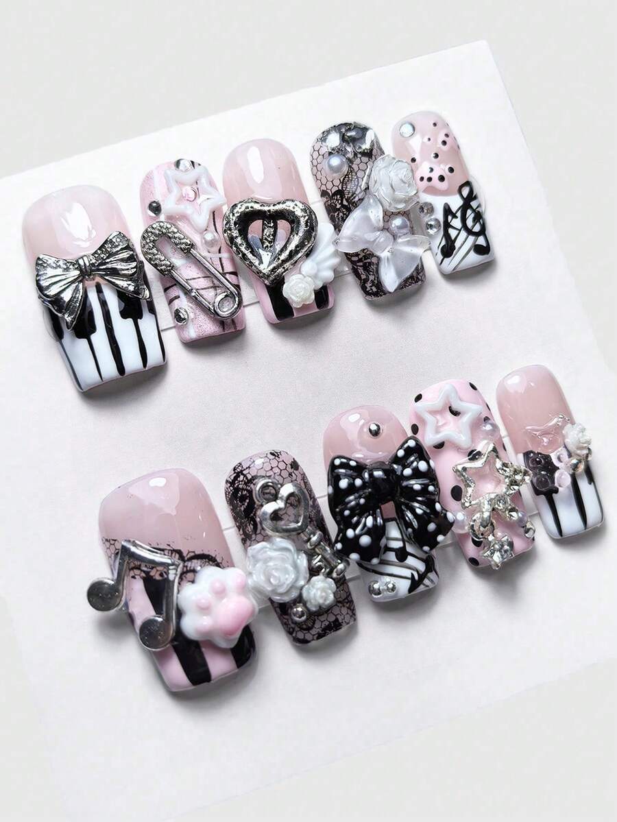 Anime 10 piezas de uñas postizas de estilo lindo con encaje negro pintado a mano + 3 piezas de cinta adhesiva de doble cara, estilo retro con teclas, estrellas, lazos y elementos de gato en blanco y negro, uñas largas y cuadradas con diamantes desmontables Y2K, arte de uñas reutilizable para todas las estaciones, adecuado para uso diario y citas