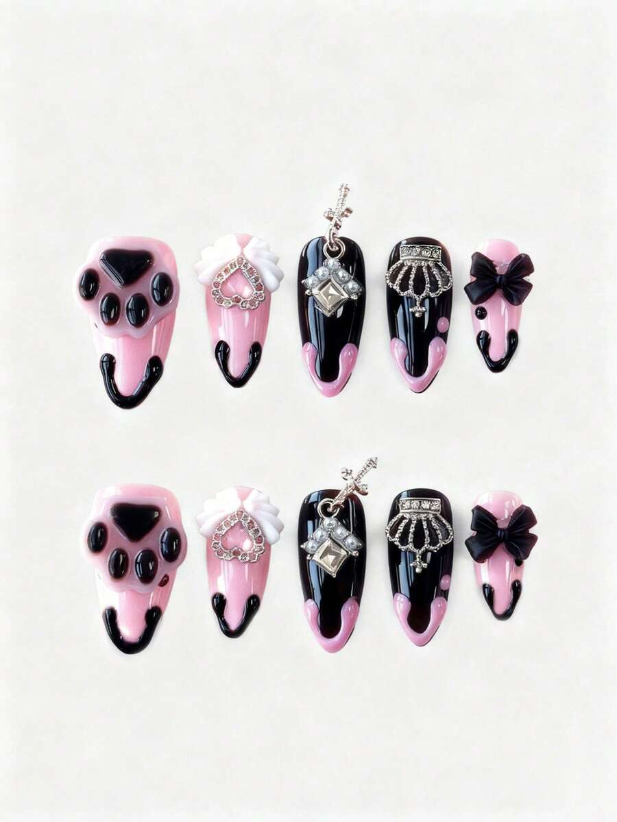 Anime 10 piezas de uñas postizas de alta calidad con diseños adorables de moños, notas musicales y estrellas, talla grande 3 piezas de adhesivo doble cara. Pegatinas de arte de uñas con cadena de cristal, estilo francés Y2K, lunares, removibles, adecuadas para vacaciones, fiestas, baile y uso diario.