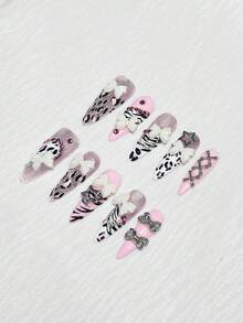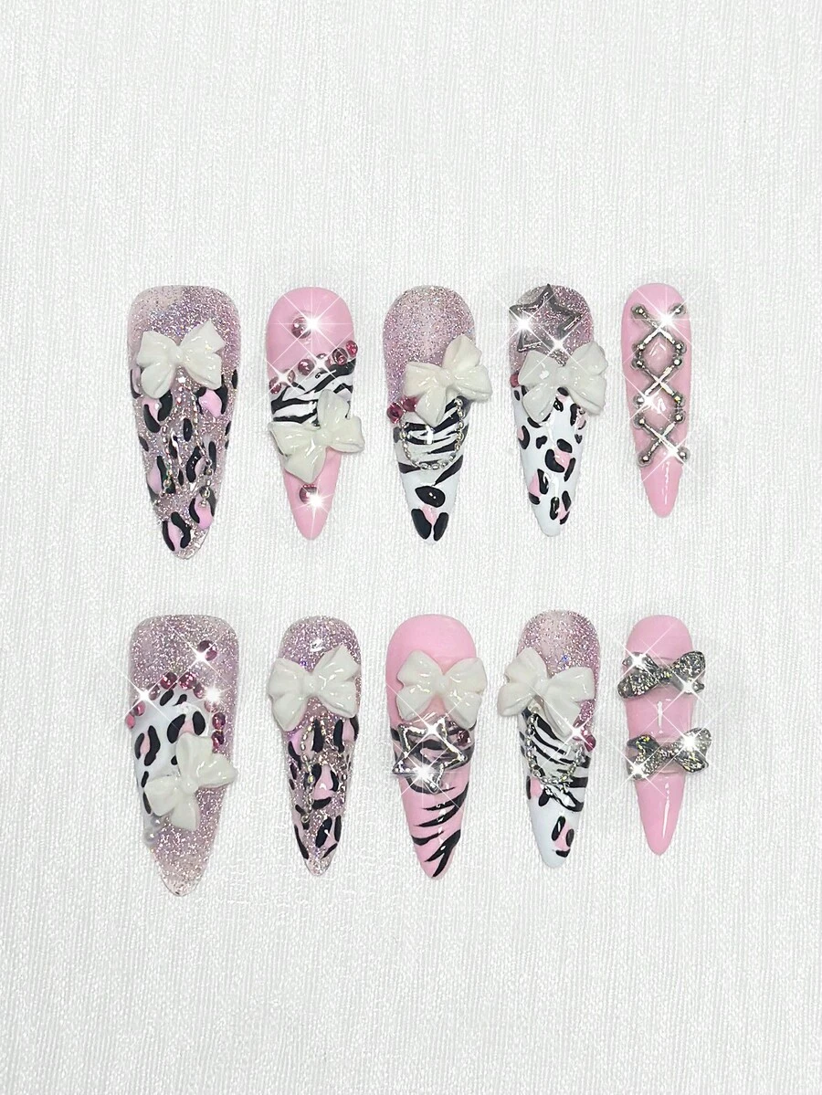 Anime 10 piezas de uñas postizas de alta calidad con diseños adorables de moños, notas musicales y estrellas, talla grande 3 piezas de adhesivo doble cara. Pegatinas de arte de uñas con cadena de cristal, estilo francés Y2K, lunares, removibles, adecuadas para vacaciones, fiestas, baile y uso diario.