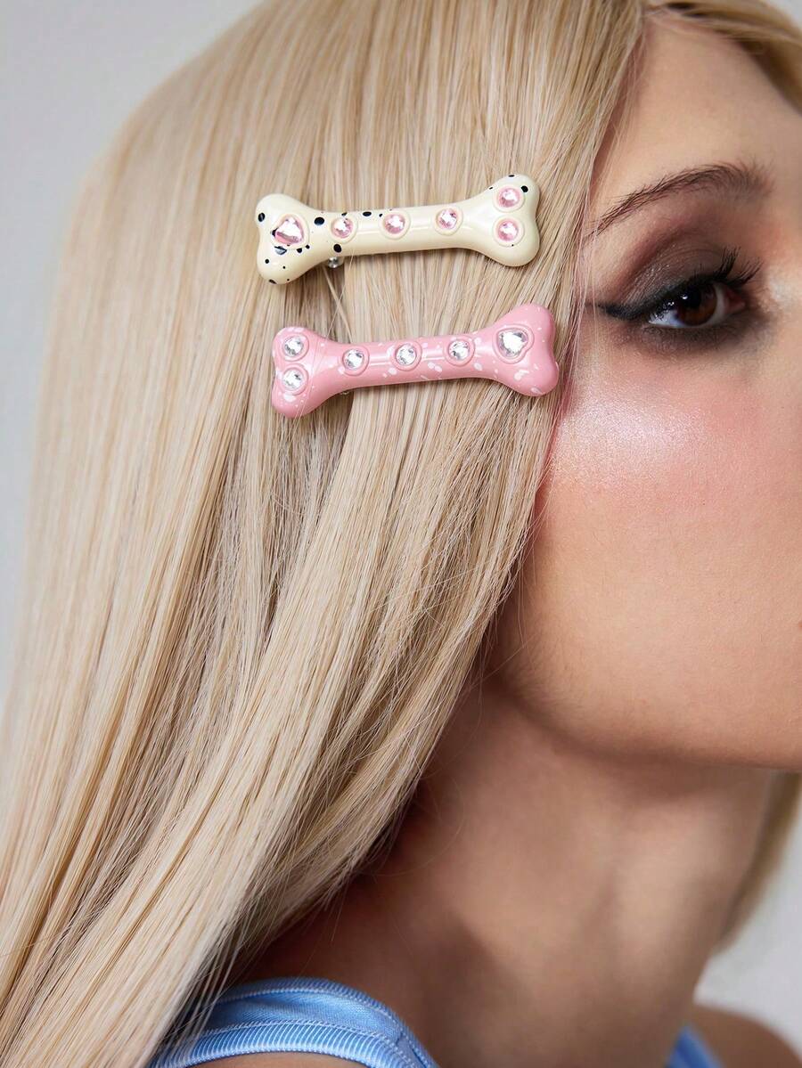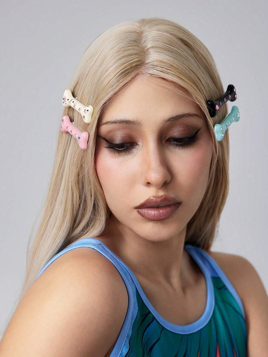 Anime 4 piezas de Pinzas para el cabello con diseño de corazón japonés lindo de colores aleatorios, pinzas para el cabello con forma de hueso de dibujos animados con piedras rhinestone, accesorios de cabello diarios para fiestas