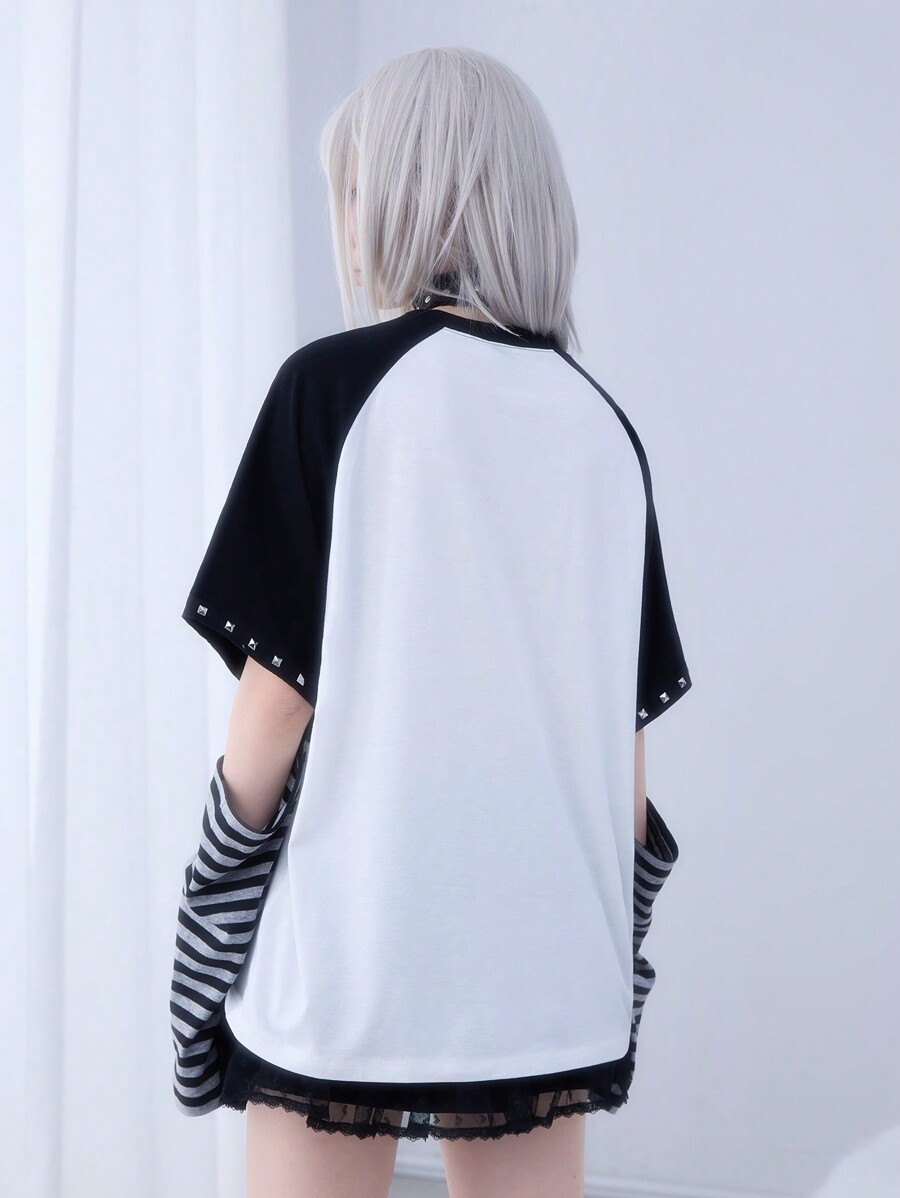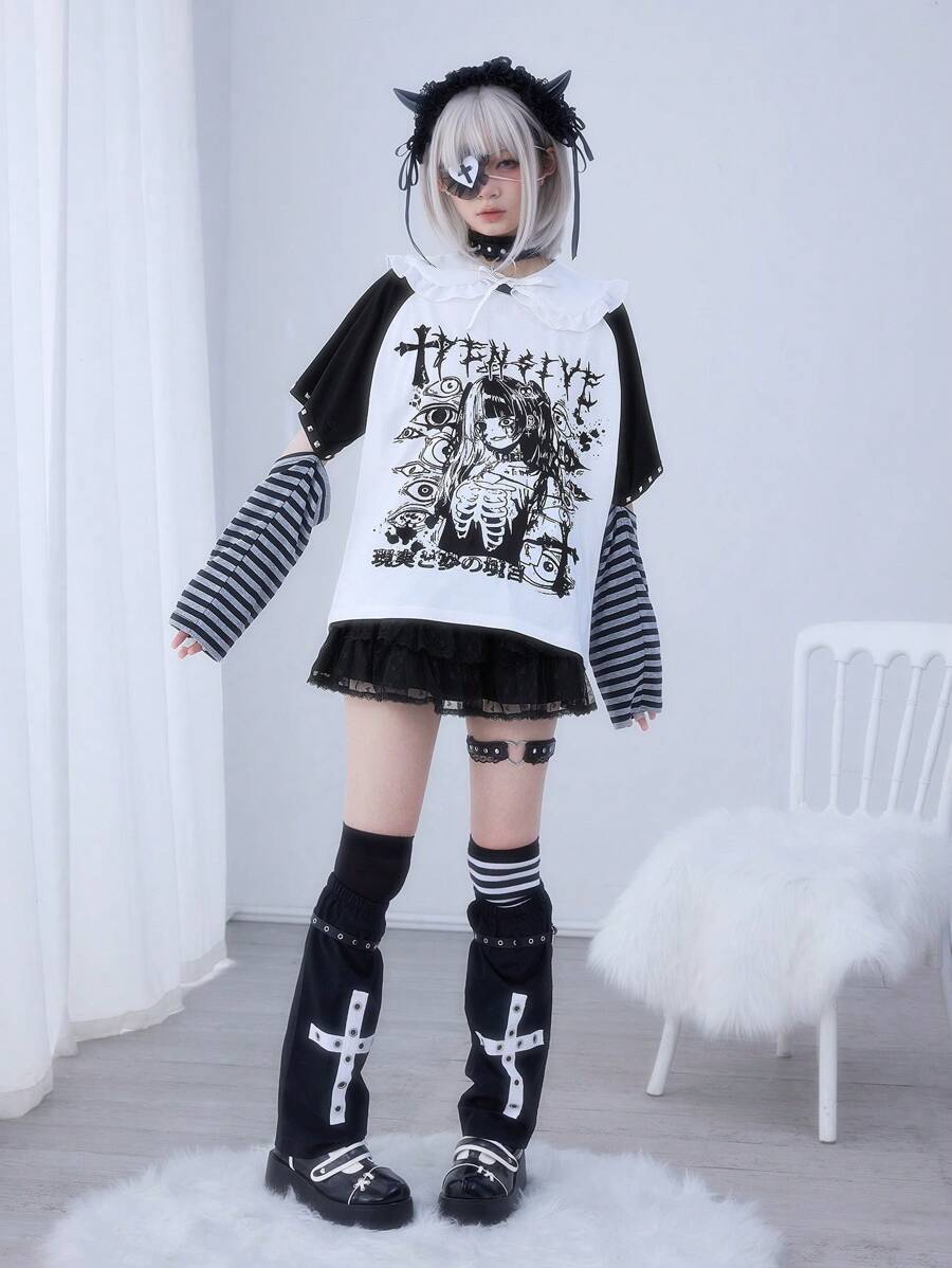 Camiseta casual de cuello redondo para mujer, 2 en 1, estilo anime punk