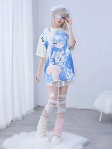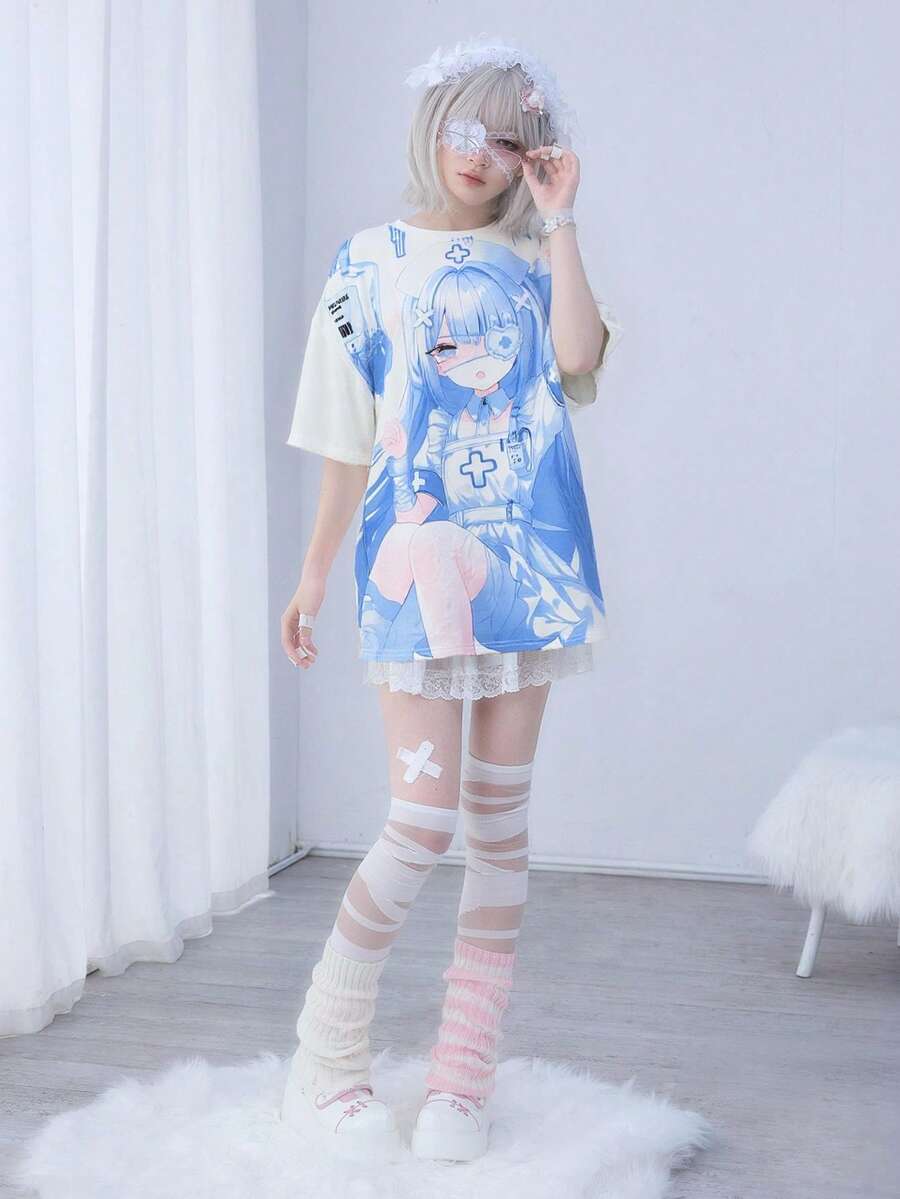 Camiseta de manga corta de cuello redondo holgada con estampado de chica anime yandere de color rosa