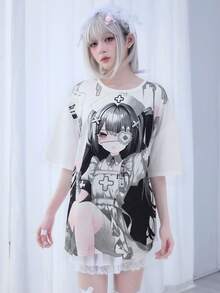 Camiseta de manga corta de cuello redondo holgada con estampado de chica anime yandere de color rosa