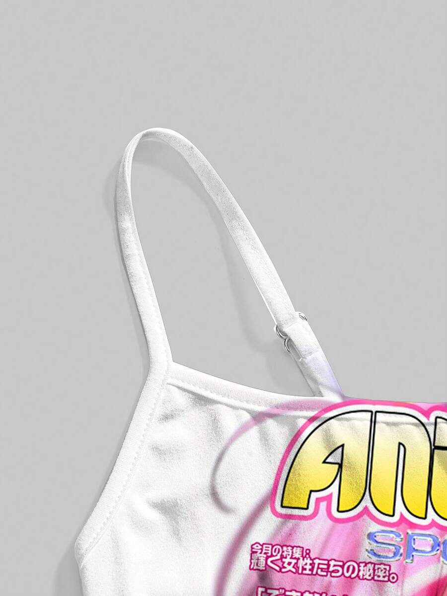 Anime Top tipo camiseta sin mangas para mujer con estampado de eslogan de personaje de dibujos animados, color rosa/blanco