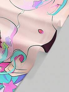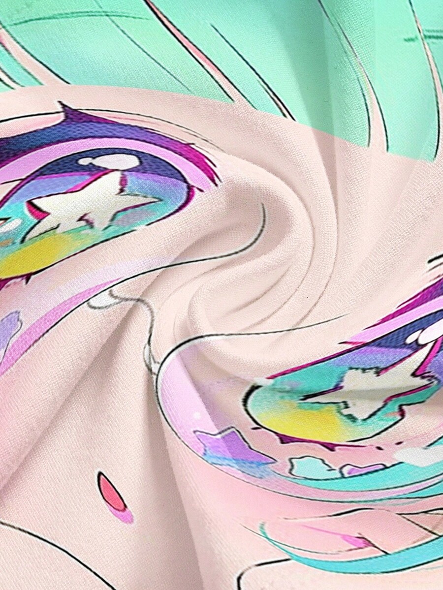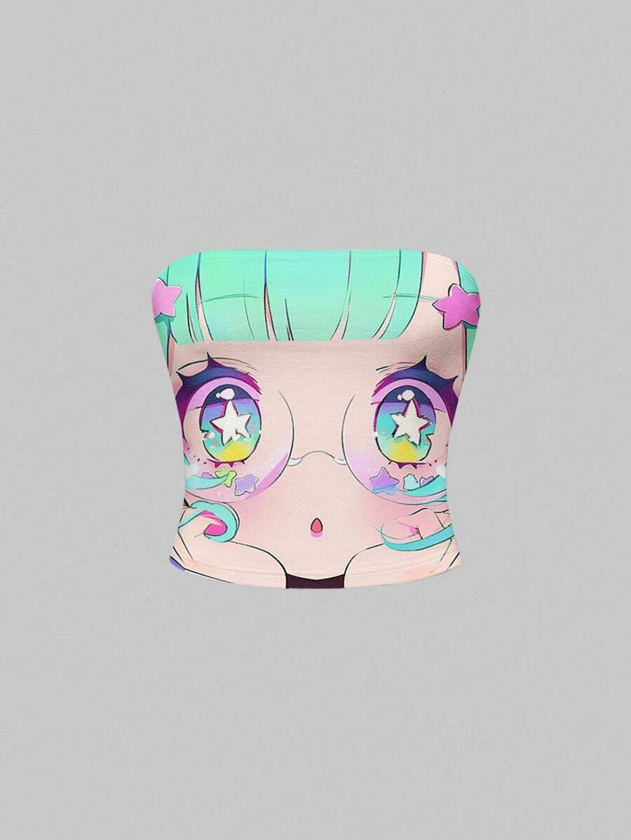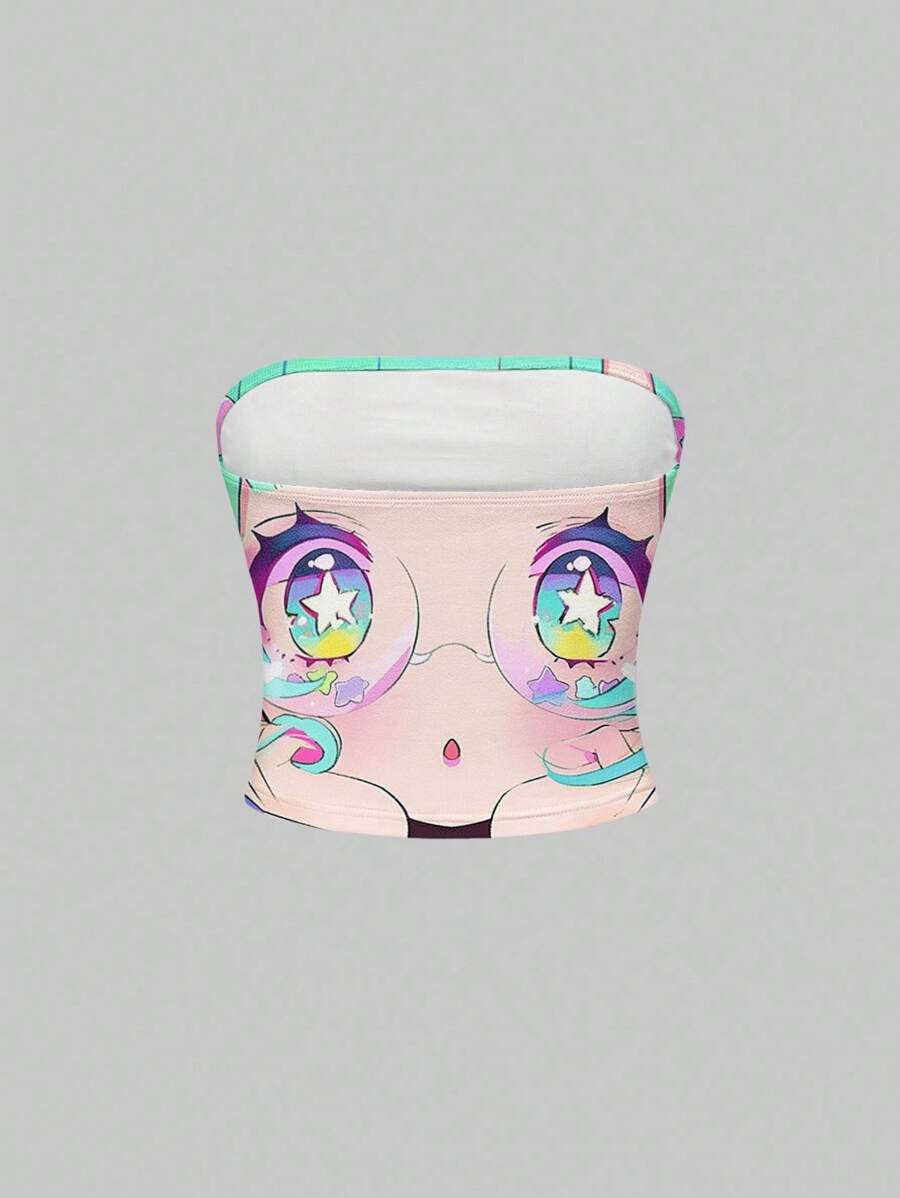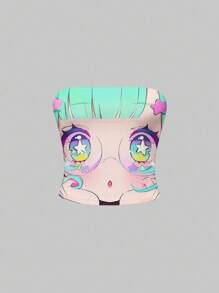 Anime Top corto sin mangas con gráfico de ojos grandes y caras kawaii de color verde y rosa, estilo subcultura Y2K para mujeres