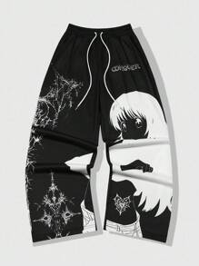 Anime Pantalones casuales rectos de pierna suelta con cintura de cordón y estampado de personajes de dibujos animados para hombre, otoño