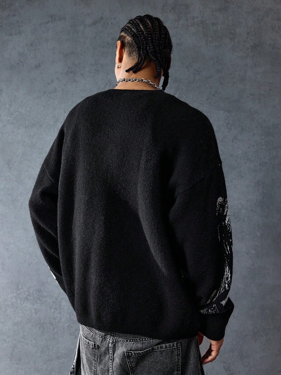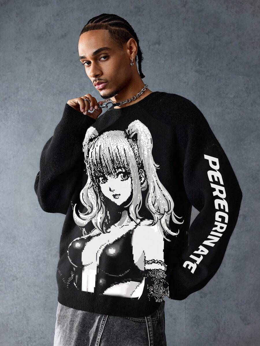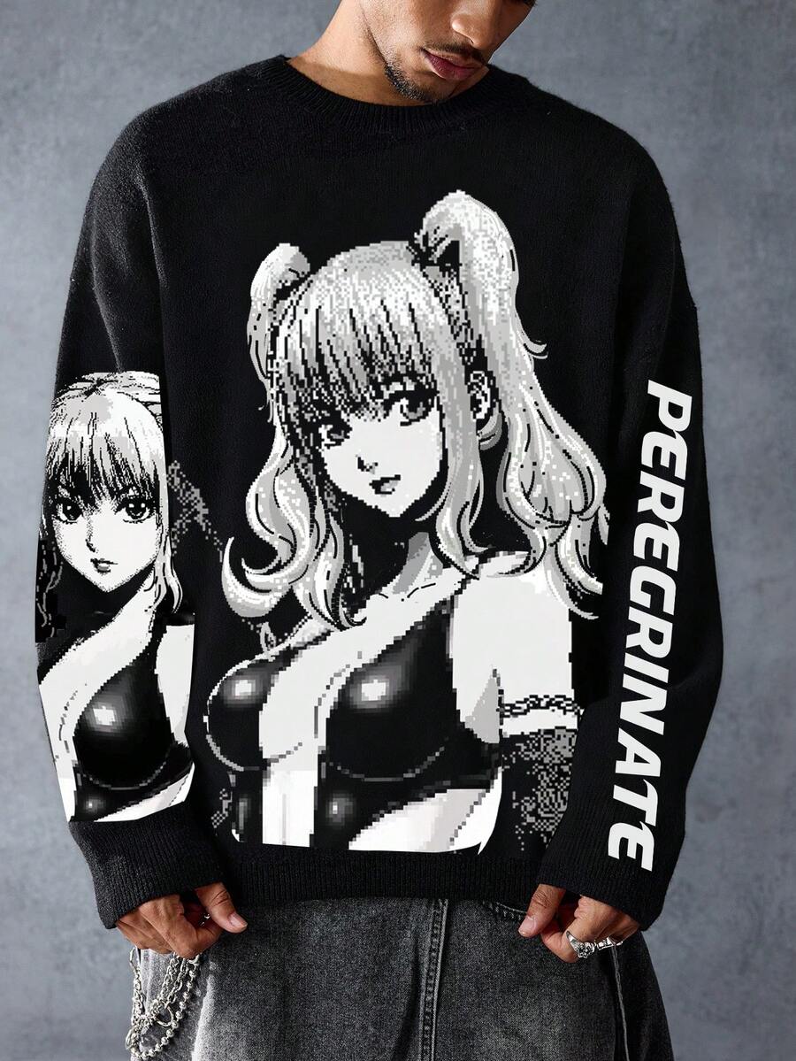 Anime Suéter holgado de estilo casual para hombre con estampado de letra de personaje de dibujos animados, cuello redondo, hombros caídos y manga larga, de estilo grunge, para otoño